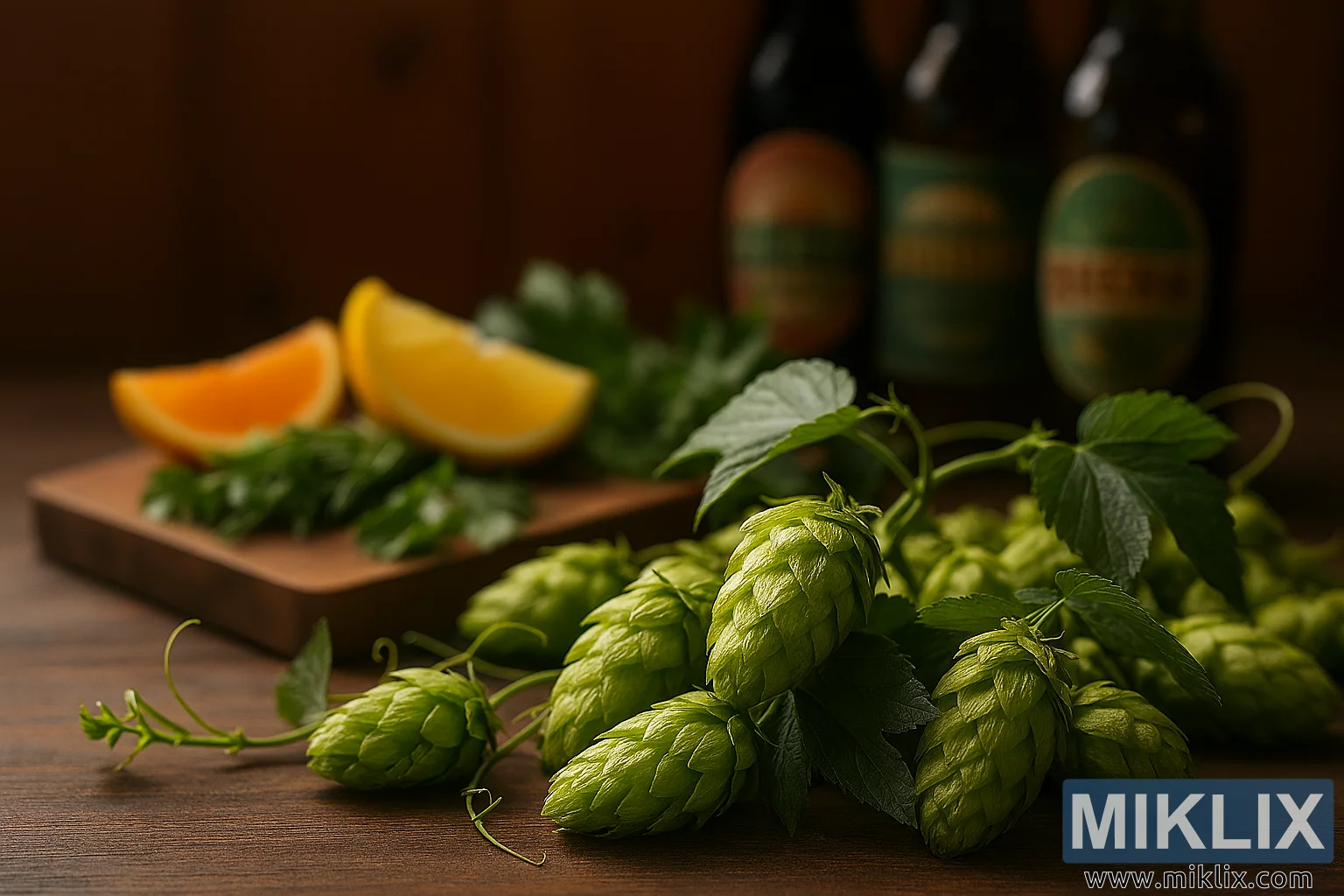 ہاپس کے بالکل پیچھے، ایک لکڑی کا سرونگ بورڈ تکمیلی اجزاء کا کیوریٹڈ انتخاب دکھاتا ہے۔ دو لیموں کے پچر — ایک نارنجی اور ایک لیموں — ساتھ ساتھ، ان کا رسیلی اندرونی حصہ روشنی کو پکڑتا ہے اور اکثر چیلان ہاپس کے ساتھ جڑے ہوئے روشن، زیست نوٹوں کی طرف اشارہ کرتا ہے۔ نارنجی پچر سنترپت رنگت کے ساتھ چمکتا ہے، جبکہ لیموں ہلکا، پارباسی کنٹراسٹ پیش کرتا ہے۔ لیموں کے پاس تازہ جڑی بوٹیوں کی ٹہنیاں ہیں: دونی اس کی سوئی کی طرح کے پتوں کے ساتھ اور اس کے پنکھوں کے ساتھ لال مرچ۔ یہ جڑی بوٹیاں ان جڑی بوٹیوں کی تجویز کرتی ہیں جو چیلان ہاپس فراہم کر سکتی ہیں، اور ان کی جگہ مہک اور ذائقے کے درمیان حسی تعامل کو تقویت دیتی ہے۔