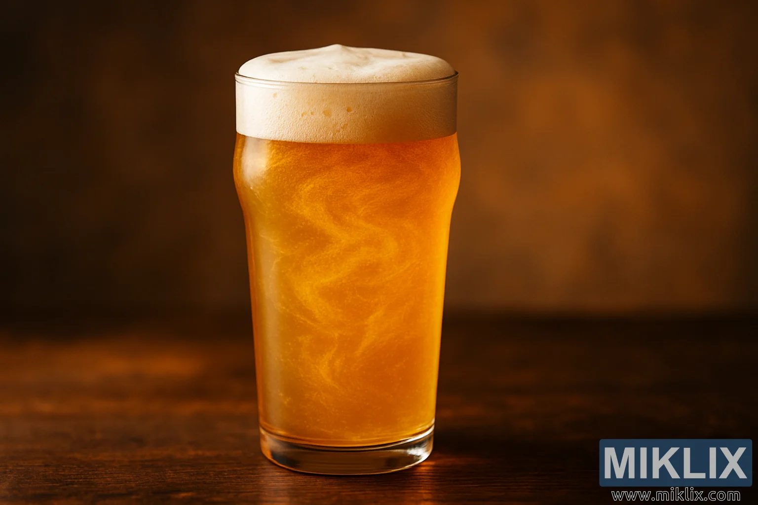 تصویر ایک چمکدار سنہری رنگت والی ایل سے بھرا ہوا ایک بصری طور پر حیرت انگیز پنٹ گلاس پیش کرتا ہے، جو ایک گرم، نرم دھندلے پس منظر کے خلاف مرکزی طور پر کھڑا ہے۔ بیئر ایک گہری عنبر کی چمک کے ساتھ چمکتی ہے، جو دیکھنے والوں کی آنکھ کو اپنی پاکیزگی اور وضاحت سے اپنی گرفت میں لے لیتی ہے۔ مائع کے اندر، نازک گھومنے کے نمونے—لگ بھگ معطل wisps یا ربن کی طرح—حرکت کا ایک متحرک احساس پیدا کرتے ہیں، جو شیشے کے نیچے سے اٹھنے والے قدرتی اثر اور جاندار کاربونیشن کی طرف اشارہ کرتے ہیں۔ ایل کی سطح پر جھاگ کے موٹے، کریمی، اور آہستہ سے گنبد والے سر کا تاج پہنایا جاتا ہے۔ اس کی ساخت امیر اور مخملی دکھائی دیتی ہے، چھوٹے، گھنے بلبلوں کے ساتھ جو اسے نرم، بادل جیسی موجودگی فراہم کرتے ہیں۔ جھاگ شیشے کے اوپری کنارے سے چپک جاتا ہے، تازگی اور پرپورنتا کے تاثر میں حصہ ڈالتا ہے۔