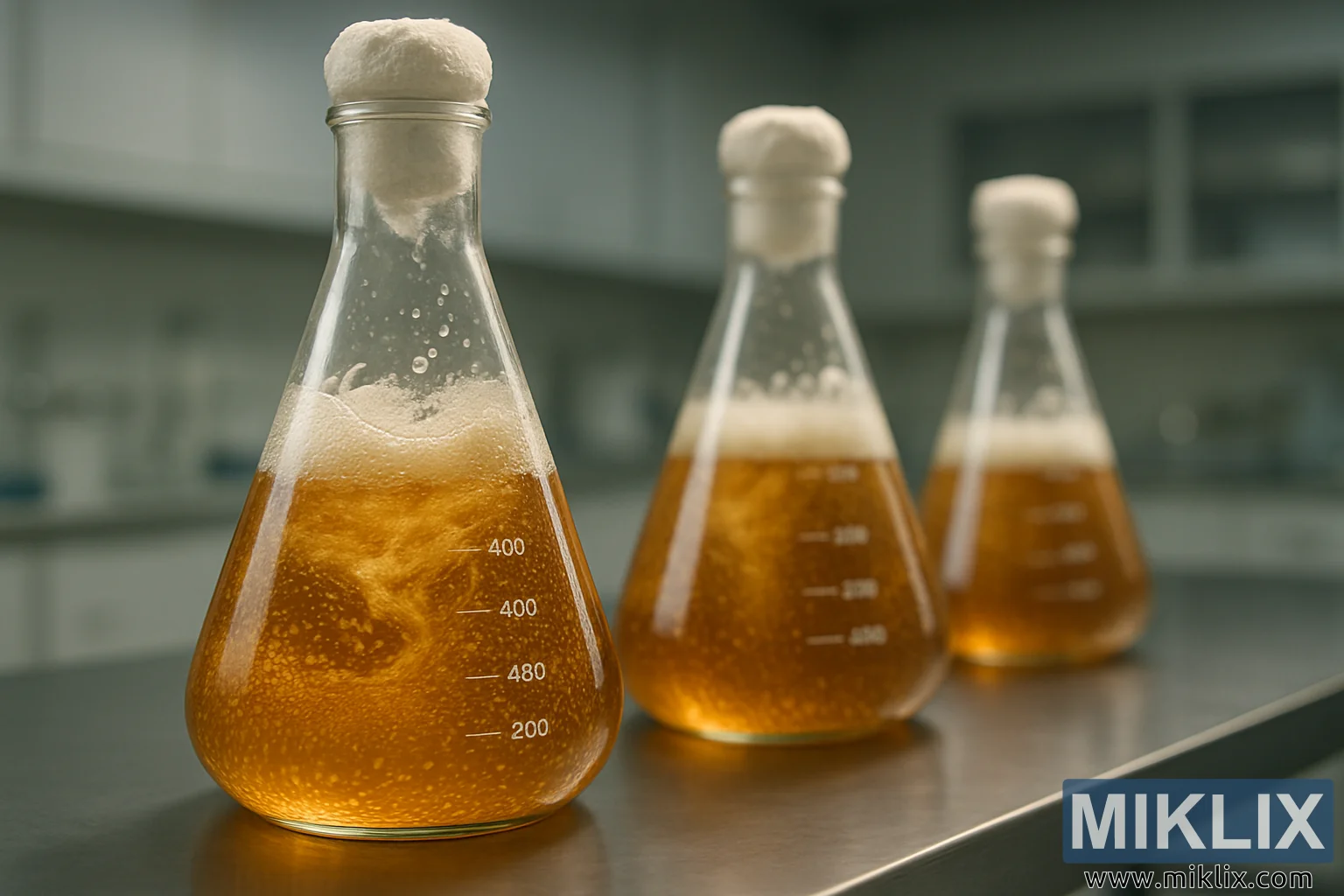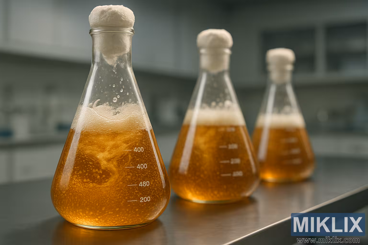 فعال fermenting مائع کے ساتھ Erlenmeyer فلاسکس کا کلوز اپ، ایک کنٹرول شدہ لیب ماحول میں خمیر کی درست پچنگ کو نمایاں کرتا ہے۔