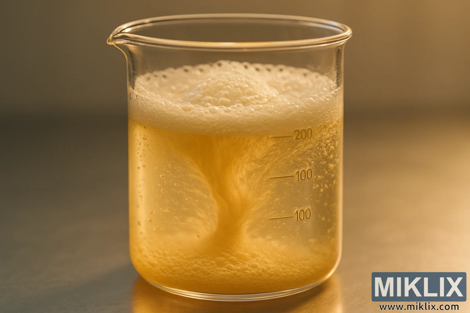 بیکر خود درست پیمائش کی لکیروں سے نشان زد ہوتا ہے — 100 mL, 200 mL, 300 mL— منظر کی سائنسی نوعیت کو تقویت دیتا ہے۔ یہ نشانات لطیف لیکن ضروری ہیں، جس سے یہ ظاہر ہوتا ہے کہ یہ صرف ایک آرام دہ تجربہ نہیں ہے بلکہ ایک کنٹرول شدہ اور نگرانی شدہ طریقہ کار ہے۔ برتن صاف، غیر جانبدار سطح کے اوپر بیٹھتا ہے، اور پس منظر نرمی سے دھندلا ہوتا ہے، جس سے ناظرین کی توجہ گھومتے ہوئے مواد پر مرکوز رہتی ہے۔ کیمرہ کا زاویہ قدرے بلند ہے، جو بھنور اور جھاگ میں ایک تفصیلی نظارہ پیش کرتا ہے، گویا ناظرین کو ابال کے دل میں جھانکنے کی دعوت دیتا ہے۔