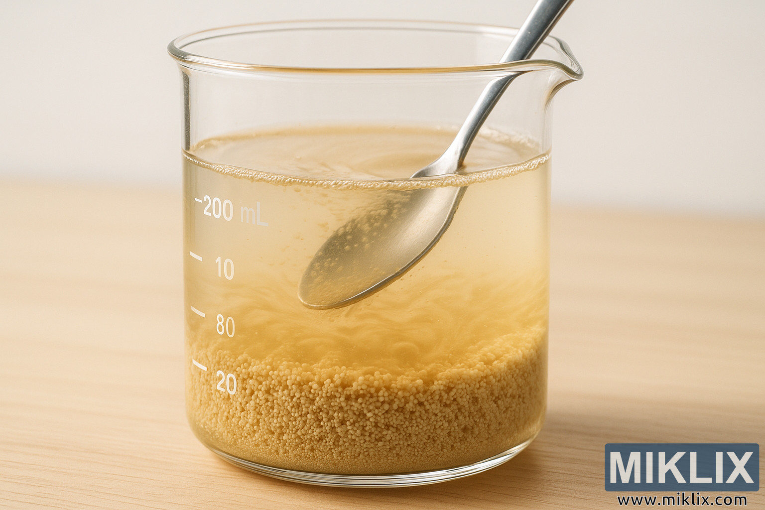 اس مباشرت اور باریک بینی سے بنائی گئی تصویر میں، ناظرین کو تیاری کے ایک پرسکون لمحے کی طرف متوجہ کیا جاتا ہے- جو کامیاب ابال کے مرکز میں ہے۔ ایک شفاف شیشے کا بیکر، 200 ملی لیٹر تک درست پیمائش کی لکیروں سے نشان زد، ہلکی لکڑی کی سطح پر بیٹھتا ہے، اس کی وضاحت مائع اور ٹھوس کے درمیان نازک تعامل کو ظاہر کرتی ہے۔ اندر، ایک پیلے رنگ کا محلول آہستہ سے گھومتا ہے جیسے دھات کا چمچ مواد کو ہلاتا ہے، جس سے خمیر کے دانے داروں کی ری ہائیڈریشن شروع ہوتی ہے جو نچلے حصے میں آباد ہوتے ہیں۔ یہ دانے، چھوٹے اور بیضوی شکل کے، نرم اور پھیلنے لگتے ہیں کیونکہ یہ پانی جذب کرتے ہیں، غیر فعال ذرات سے فعال حیاتیاتی ایجنٹوں میں منتقل ہوتے ہیں۔ یہ عمل لطیف لیکن اہم ہے، ایک تبدیلی جو ابال کے لیے جوش و خروش اور مستقل مزاجی کے ساتھ سامنے آنے کا مرحلہ طے کرتی ہے۔