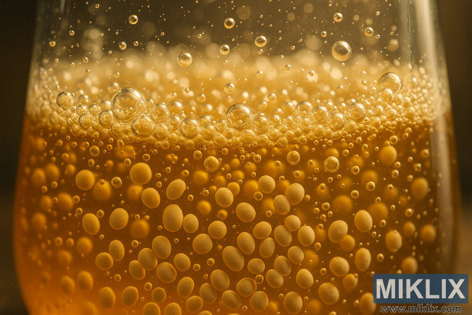 پس منظر نرمی سے دھندلا ہوا ہے، خاموش لہجے میں پیش کیا گیا ہے جو آہستہ سے پیچھے ہٹتے ہیں اور خمیر کرنے والے مائع کو پوری توجہ مرکوز کرنے دیتے ہیں۔ میدان کی یہ اتھلی گہرائی قربت اور توجہ کا احساس پیدا کرتی ہے، جو دیکھنے والے کی نظر کو بلبلوں اور جھاگ کی پیچیدہ تفصیلات کی طرف کھینچتی ہے۔ یہ خوردبین کے ذریعے جھانکنے یا خمیر کو اس کی کیمیا کو انجام دیتے ہوئے دیکھ کر ایک خمیر کے کنارے پر کھڑے ہونے کے احساس کو جنم دیتا ہے۔ دھندلا پس منظر ایک پرسکون، کنٹرول شدہ ماحول کی تجویز کرتا ہے—شاید ایک لیبارٹری، ایک brewhouse، یا ایک ہومبرو سیٹ اپ—جہاں درجہ حرارت، آکسیجن، اور مائکروبیل سرگرمی کے نازک توازن کو سہارا دینے کے لیے حالات کو احتیاط سے برقرار رکھا جاتا ہے۔