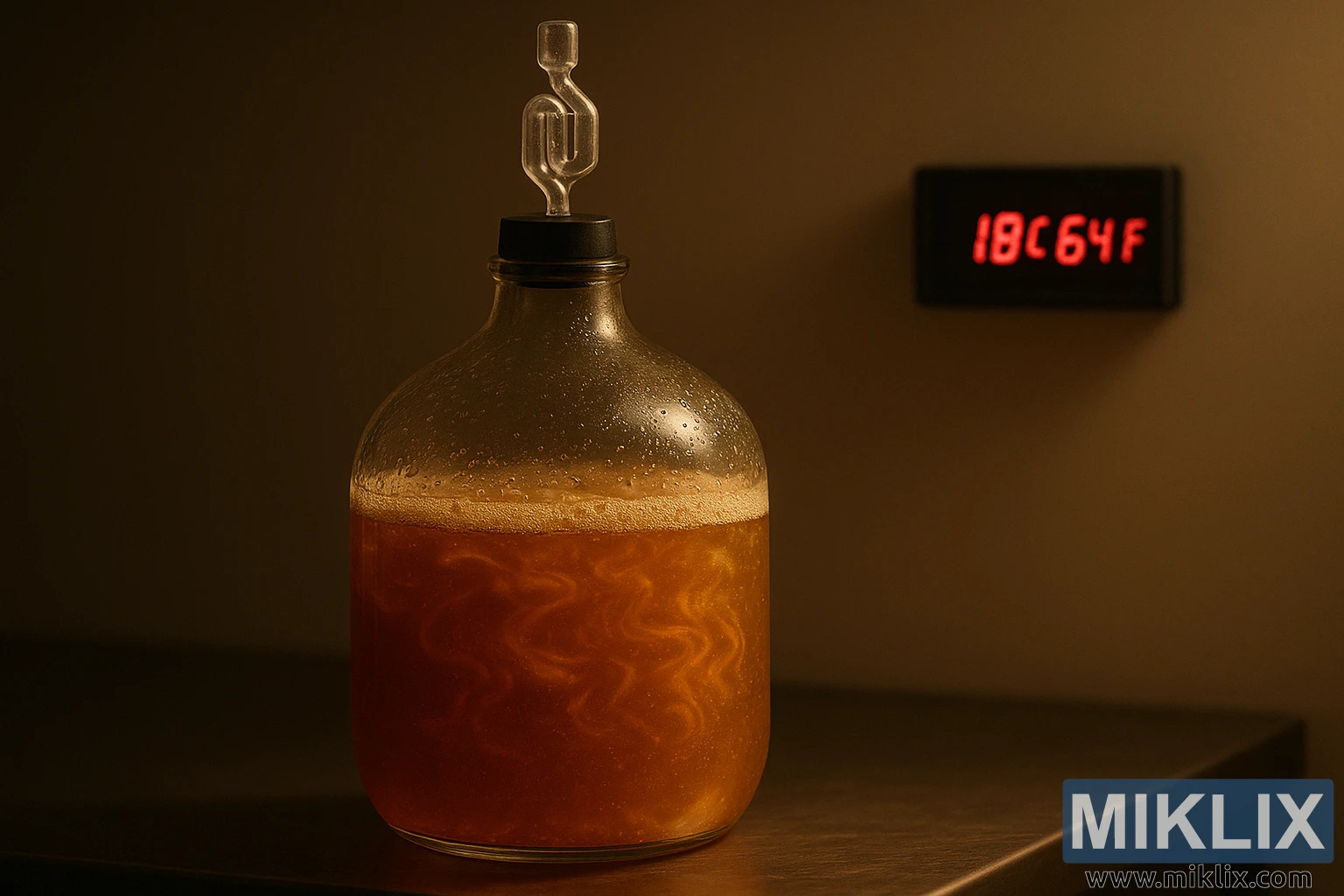 اسٹیل ورک بینچ پر امبر بیئر کو خمیر کرنے کا ایک چمکتا ہوا کاربوائے، جس میں ڈیجیٹل ڈسپلے 18°C دکھا رہا ہے، جو دستکاری اور درستگی کی علامت ہے۔