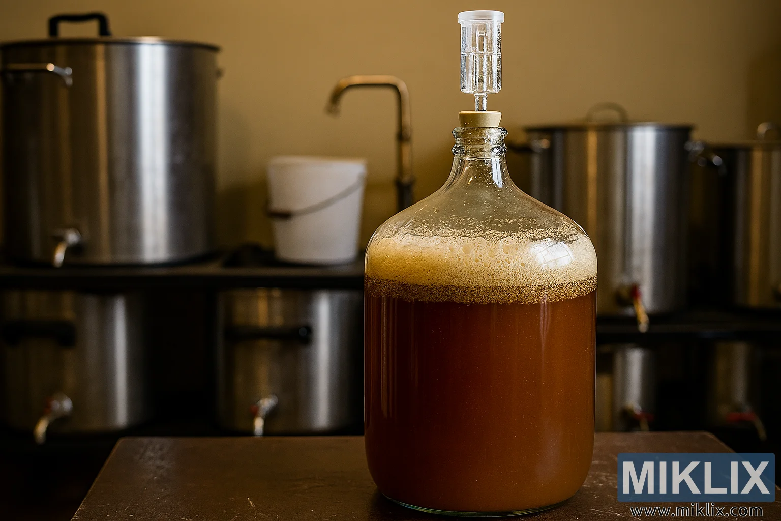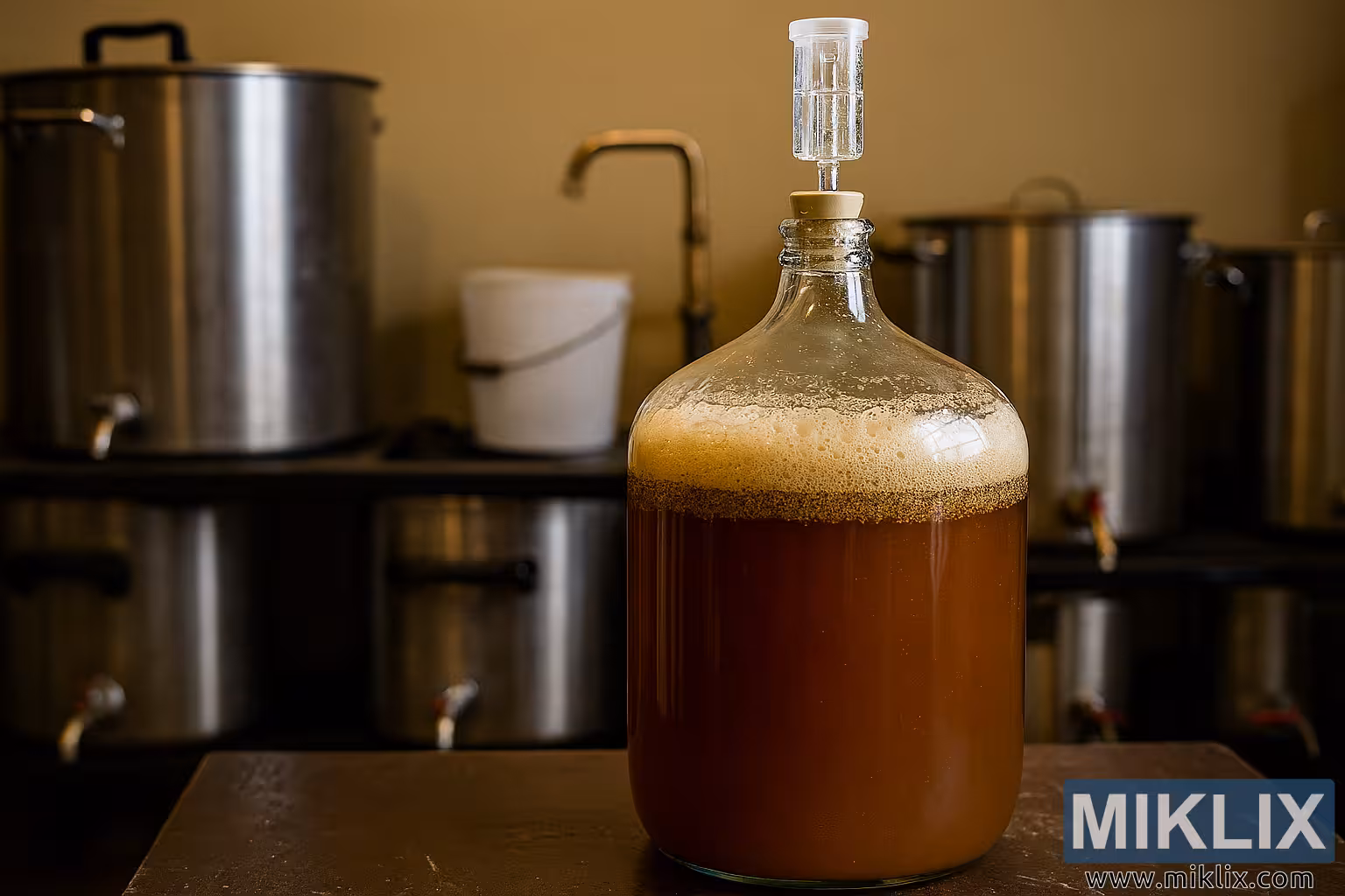 ایک شیشے کے کاربوئے میں انگلش الی کو خمیر کرنے کی اعلی ریزولیوشن تصویر، پس منظر میں کیٹلز اور آلات کے ساتھ ایک حقیقت پسندانہ گھریلو سازی کے ماحول میں سیٹ کی گئی ہے۔