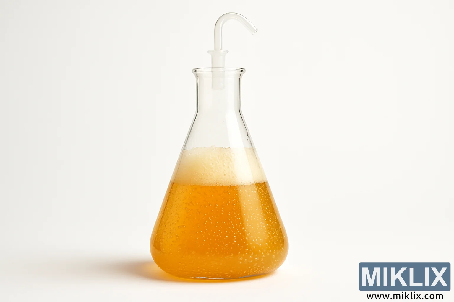 واضح ایرلن میئر فلاسک کے اندر ایک سنہری مائع خمیر ہوتا ہے، جو جھاگ والی سطح کے نیچے آہستہ سے بلبلا جاتا ہے، جو ایک درست لیبارٹری کی ترتیب میں صاف سفید پس منظر کے خلاف سیٹ کیا جاتا ہے۔