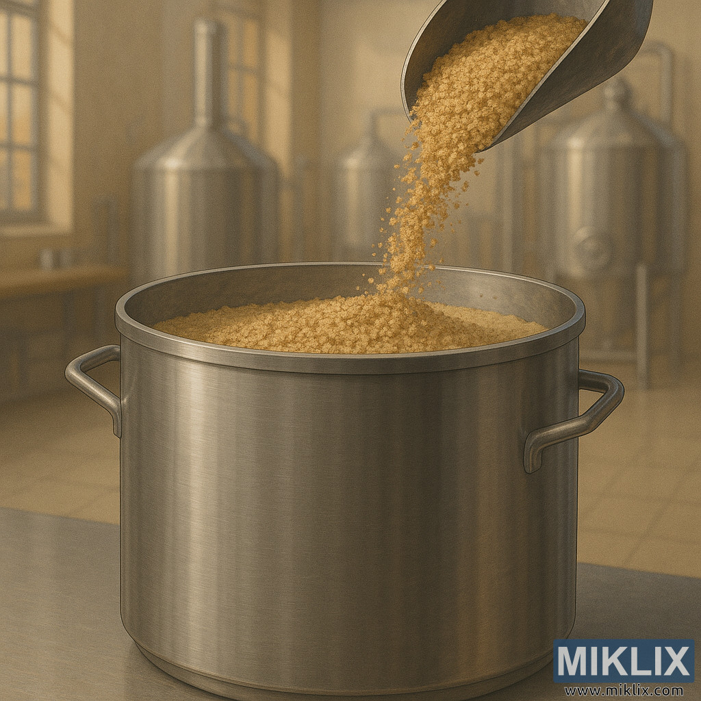 فوٹو ریئلسٹک ڈیجیٹل آرٹ ورک پکنے کے عمل کے ایک اہم مرحلے کی عکاسی کرتا ہے: چیک طرز کے لیگر کے لیے پسے ہوئے مالٹ کی میشنگ۔ کمپوزیشن کے مرکز میں، پیش منظر پر حاوی ہے، ایک جدید میش برتن ہے جو برش شدہ سٹینلیس سٹیل سے تیار کیا گیا ہے۔ اس کی بیلناکار شکل، مضبوط سائیڈ ہینڈلز، اور چمکتی ہوئی دھاتی شین پائیداری اور درستگی کا اظہار کرتی ہے، جب کہ اس کی صاف ستھری، پالش شدہ سطح گرم، پھیلی ہوئی روشنی کی عکاسی کرتی ہے جو شراب خانے کو بھرتی ہے۔ برتن سب سے اوپر کھلا ہوا ہے، جو ایک جھاگ دار سنہری میش کو ظاہر کرتا ہے جو برتن میں تازہ ملٹ کے جھرنوں کے طور پر بننے کے عمل میں سرگرم ہے۔