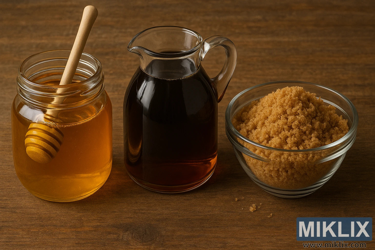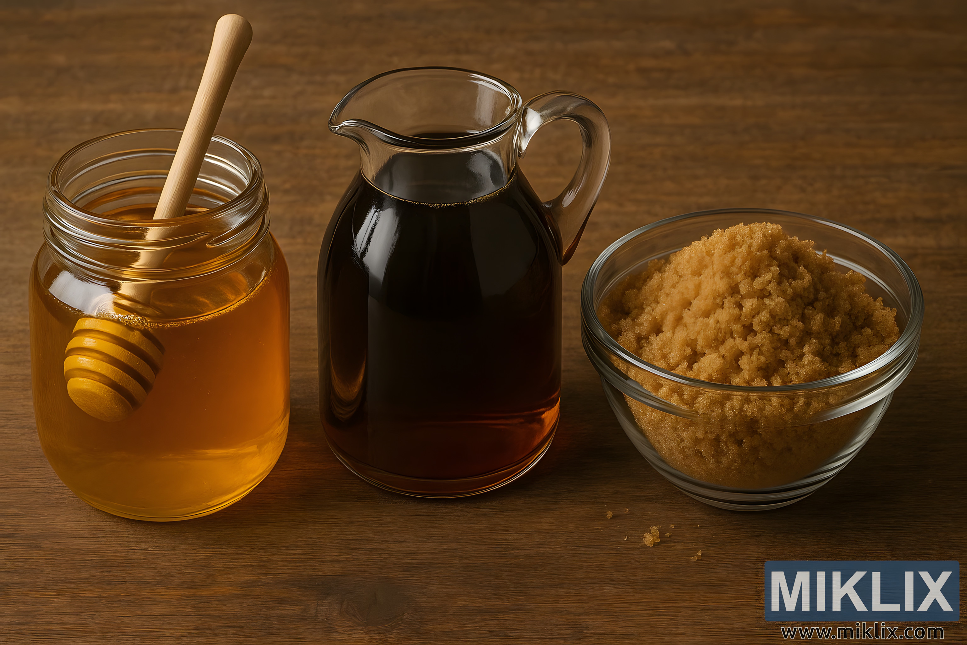 شہد، میپل سیرپ، اور براؤن شوگر کا ایک دہاتی ڈسپلے گرم، قدرتی روشنی کے ساتھ پکنے میں عام کیتلی ملحقہ چیزوں کو نمایاں کرتا ہے۔