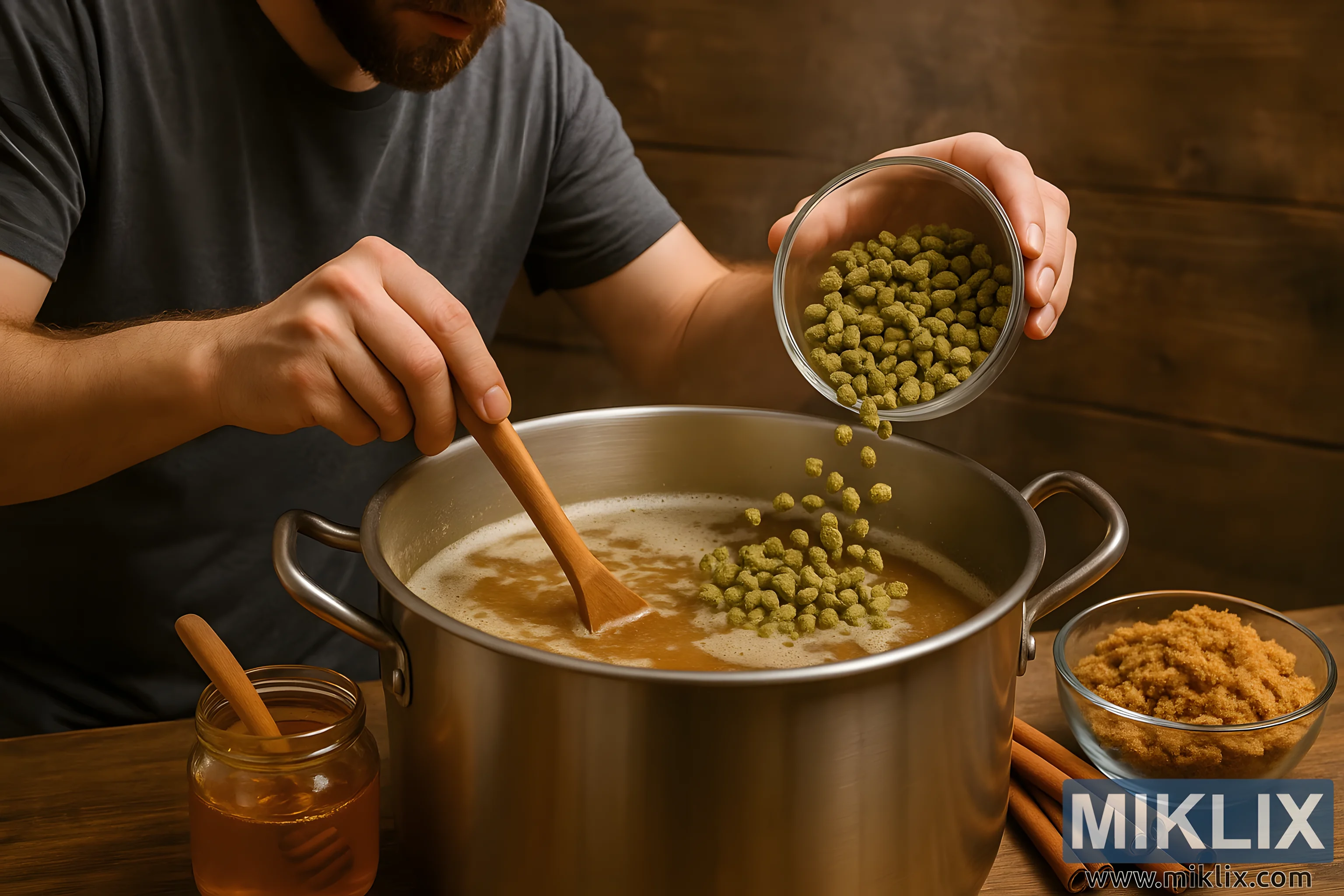 مجموعی طور پر، تصویر توجہ مرکوز تخلیقی صلاحیتوں اور حسی مصروفیت کا ایک موڈ پیش کرتی ہے۔ یہ گھریلو شراب بنانے کی نرم مزاجی کا جشن مناتا ہے — ہلچل، ڈالنا، پیمائش کرنا — اور شروع سے کسی چیز کو تیار کرنے کے پرسکون اطمینان کا۔ ہاپس، شہد، براؤن شوگر، اور دار چینی کی موجودگی ایک ترکیب بتاتی ہے جو پیچیدگی اور توازن میں جھکتی ہے، تلخی کو مٹھاس کے ساتھ ملاتی ہے، مسالا گہرائی کے ساتھ۔ اس کی ساخت، روشنی اور تفصیل کے ذریعے، تصویر ایک رسم اور اظہار کی ایک شکل دونوں کے طور پر پکنے کی کہانی بیان کرتی ہے، جہاں ہر جزو کا انتخاب احتیاط سے کیا جاتا ہے اور ہر حرکت ایک بڑے، ذائقے دار سفر کا حصہ ہوتی ہے۔