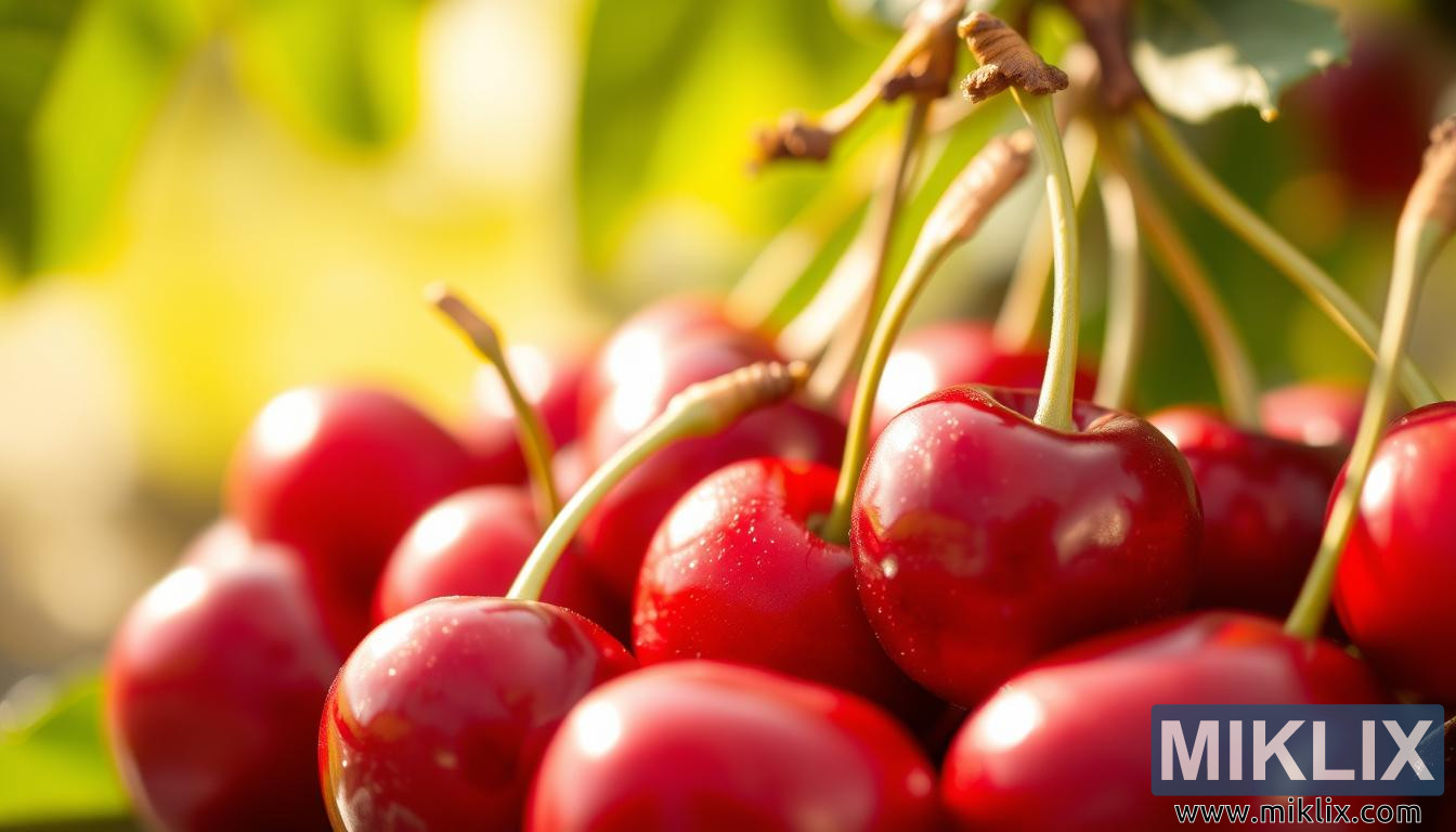 گرم روشنی میں چمکتی گہری سرخ چیریوں کا متحرک قریبی اپ، دل کی صحت اور تندرستی کے لیے ان کے اینٹی آکسیڈینٹ اور سوزش سے بچنے والے فوائد کو اجاگر کرتا ہے۔