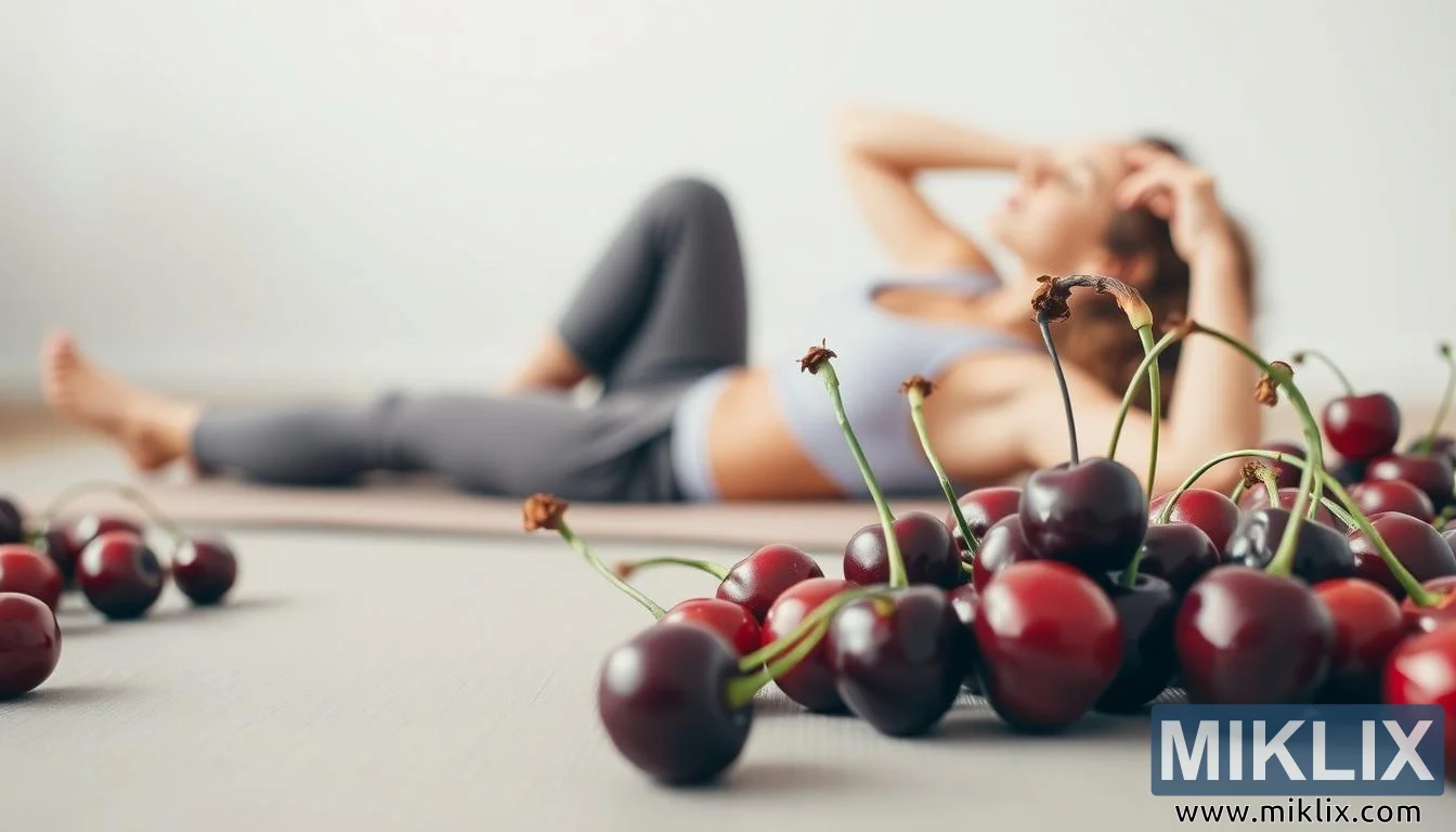 قریب میں تازہ چیری کے ساتھ ورزش کے بعد آرام کرتے ہوئے ایک شخص کا پر سکون منظر، صحت یابی، جوان ہونے اور مجموعی صحت کے لیے ان کے فوائد کو اجاگر کرتا ہے۔