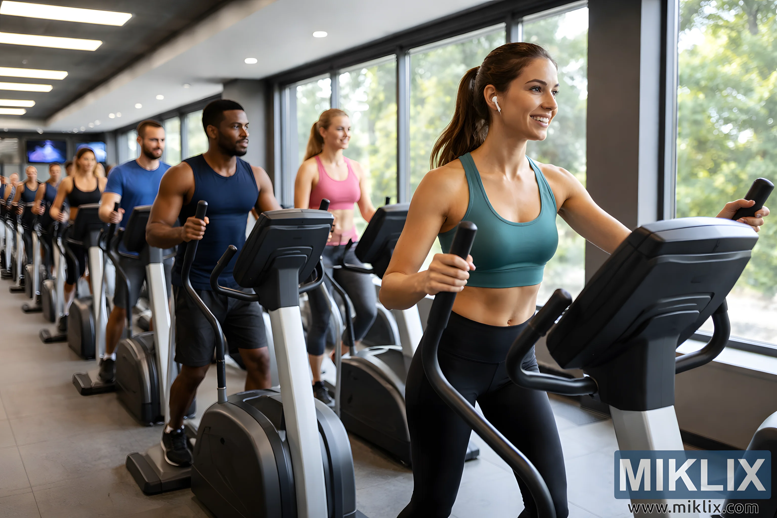 Group Cardio Session on Elliptical Machines in a Bright Modern Gym