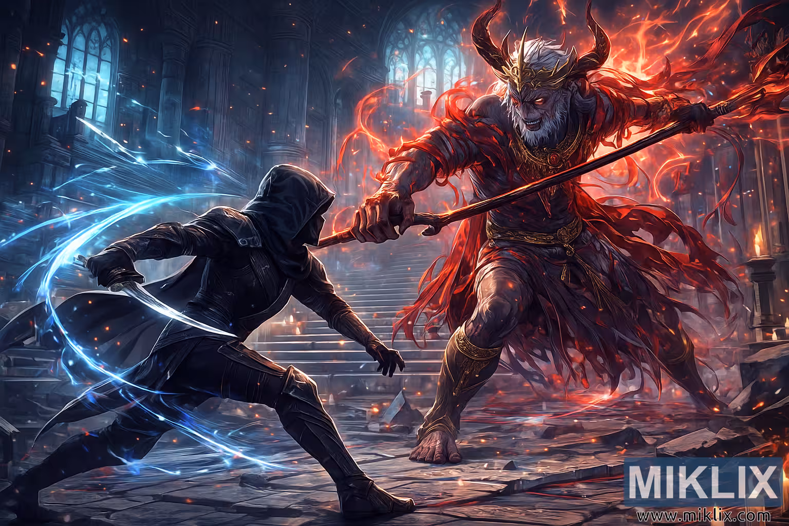 Sự tương phản giữa hai chiến binh tạo nên cốt lõi thị giác của toàn cảnh: màu xanh lạnh lẽo đối lập với màu đỏ rực lửa, sự lén lút đối lập với sự tàn bạo, sự phàm trần đối lập với á thần. Tarnished, nhỏ bé nhưng hung dữ, tựa như một mảnh bóng đêm, trong khi Mohg sừng sững như một ngọn lửa khổng lồ của máu và cuồng nộ. Tia lửa bắn ra tứ tung nơi lưỡi kiếm gặp đinh ba; sàn nhà bên dưới nứt vỡ dưới sức ép của cú va chạm. Những ngọn nến rung chuyển bên rìa nhà thờ, ngọn lửa uốn cong trong những làn sóng ma thuật và động lực dữ dội. Toàn bộ bố cục như lơ lửng trên bờ vực của một vụ nổ — một khoảnh khắc duy nhất trong cuộc chiến giữa bóng tối và lửa, giữa sự sống và sự lãng quên.