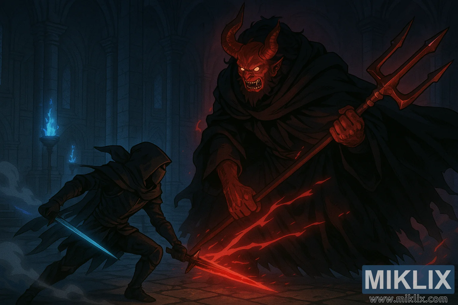 Tác phẩm nghệ thuật này khắc họa một cuộc đối đầu kịch tính lấy cảm hứng từ Elden Ring, được thể hiện theo phong cách anime chi tiết cao gợi nhớ đến nghệ thuật ý tưởng điện ảnh sơn dầu. Cảnh quay diễn ra bên trong Nhà thờ Forsaken, một căn phòng rộng lớn, vang vọng với những cột trụ cao vút và những mái vòm chìm trong bóng tối. Nhà thờ trải dài trong bóng tối theo mọi hướng, gợi lên cả sự hùng vĩ lẫn sự suy tàn, những mái vòm đá giao nhau trên cao trong những mái vòm uốn lượn mờ ảo trong làn sương màu chàm đậm. Ngọn lửa phù thủy xanh lạnh lẽo bùng cháy từ những chiếc đèn treo tường dọc theo các bức tường, chiếu sáng rực rỡ lên những viên gạch đá nứt nẻ và làn sương mù trôi nổi bò dọc mặt đất như hơi thở từ vực thẳm bên dưới.