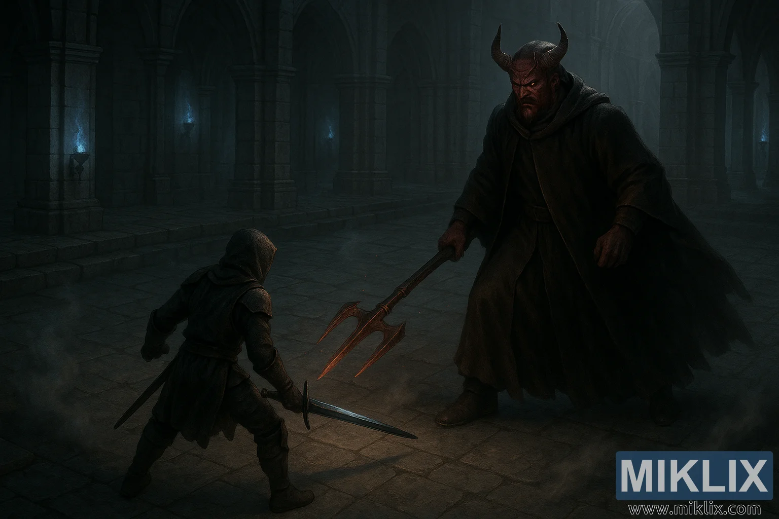 Bức ảnh này khắc họa một cuộc đối đầu chân thực, u ám giữa hai nhân vật đang chìm đắm trong khoảnh khắc bạo lực căng thẳng bên trong một nhà thờ rộng lớn. Khung cảnh tĩnh lặng nhưng nặng nề, được chiếu sáng thưa thớt bởi những ngọn lửa xanh lạnh lẽo, tỏa ra những vòng tròn ánh sáng mỏng manh nguy hiểm trên nền đá. Hình khối của không gian thật đồ sộ — mái vòm cao vút, những mái vòm gothic góc cạnh, những cột trụ dày như thân cây, và những cầu thang mờ dần trong bóng tối. Mọi thứ đều bị bao phủ bởi bầu không khí xám xanh, như thể chính không khí nặng trĩu bởi tuổi tác, bụi bặm và sức mạnh tiềm ẩn. Sương mù cuộn thấp xuống sàn, bắt ánh sáng thành những dải bạc mờ ảo. Khung cảnh mang cảm giác từng được tôn nghiêm, nhưng đã bị bỏ hoang từ lâu.