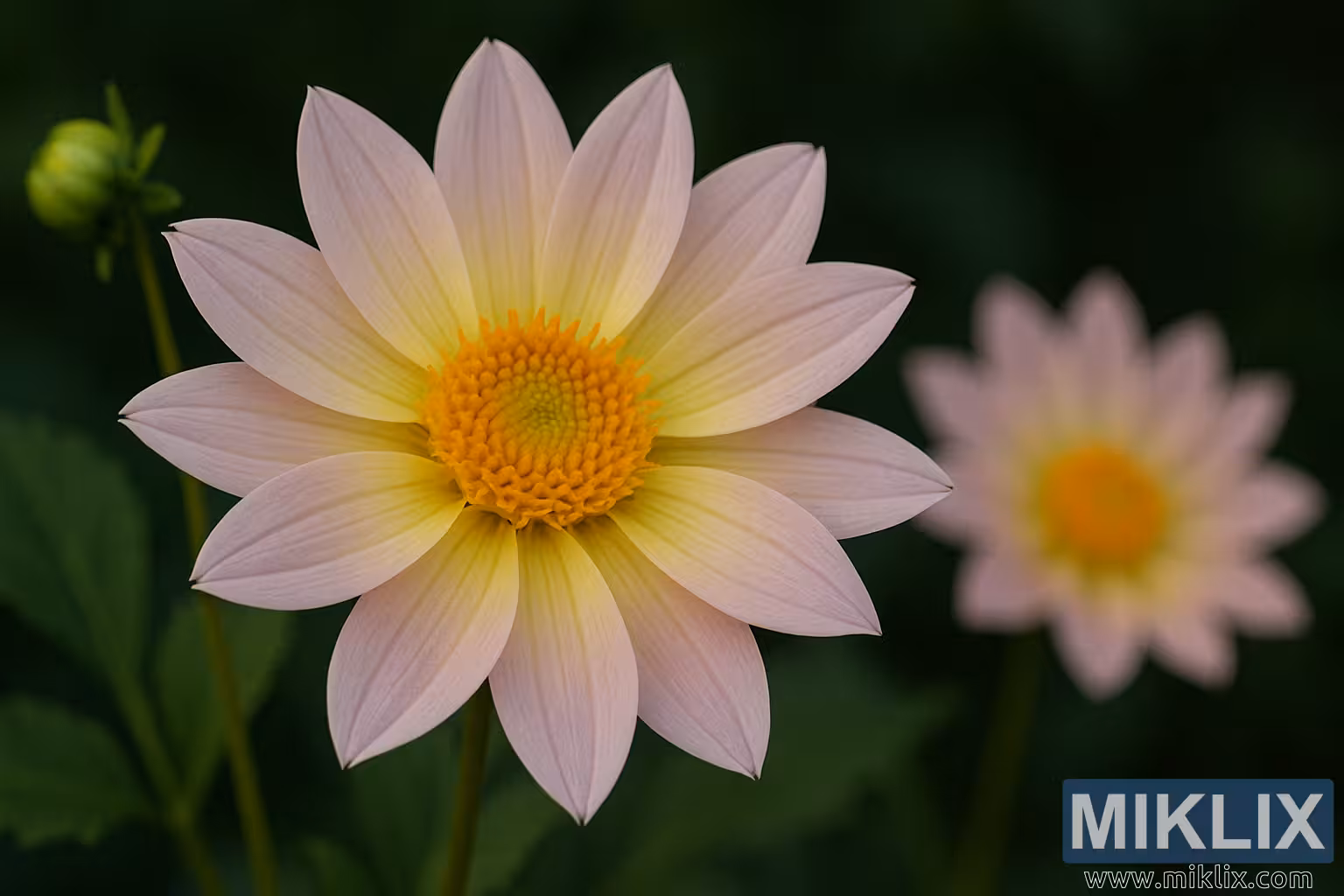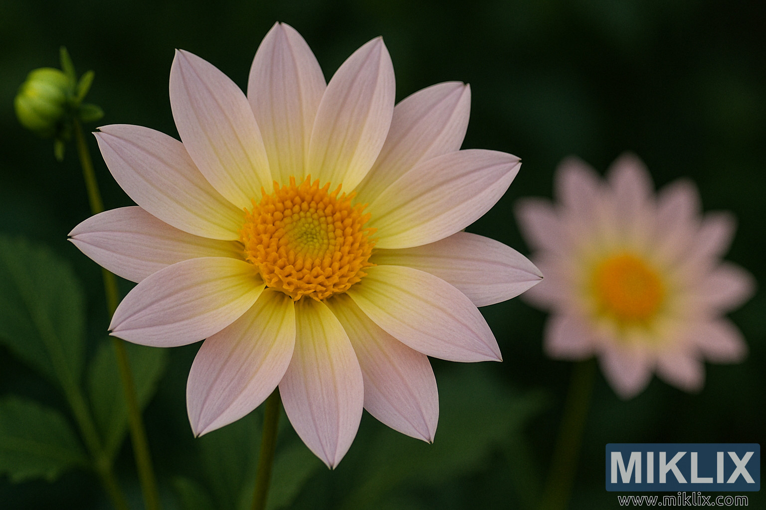 Bức ảnh này mô tả một bông hoa thược dược Happy Butterfly đang nở rộ, được chụp trong một bố cục phong cảnh nhấn mạnh cả hình dạng hoa súng và bảng màu rực rỡ của nó. Chiếm ưu thế ở tiền cảnh là bông hoa chính, nở hoàn hảo, với những cánh hoa dài, mảnh mai tỏa ra từ trung tâm màu vàng kim rực rỡ. Mỗi cánh hoa mịn màng và thon nhẹ thành một điểm tinh tế, giống như sự đối xứng tinh tế của cánh hoa súng. Màu sắc của chúng thật mê hoặc: bắt đầu với màu vàng dịu nhẹ, ấm áp của mặt trời gần gốc, màu sắc dần dần hòa quyện thành màu hồng phớt và hồng nhạt dọc theo chiều dài, kết thúc bằng các cạnh màu oải hương nhạt nhất. Sự chuyển màu này tạo ra hiệu ứng rực rỡ, như thể bông hoa được tràn ngập ánh sáng, tỏa ra sự ấm áp và mềm mại từ lõi vàng của nó.