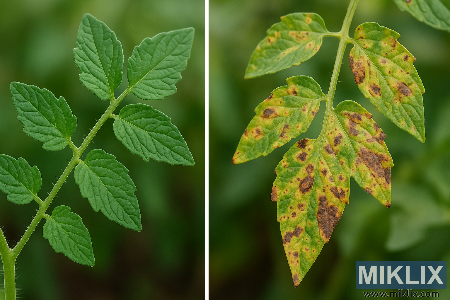 Hình ảnh so sánh chi tiết cho thấy lá cà chua khỏe mạnh bên cạnh lá bị bệnh có đốm và đổi màu, hữu ích để xác định các vấn đề về sức khỏe của cây.