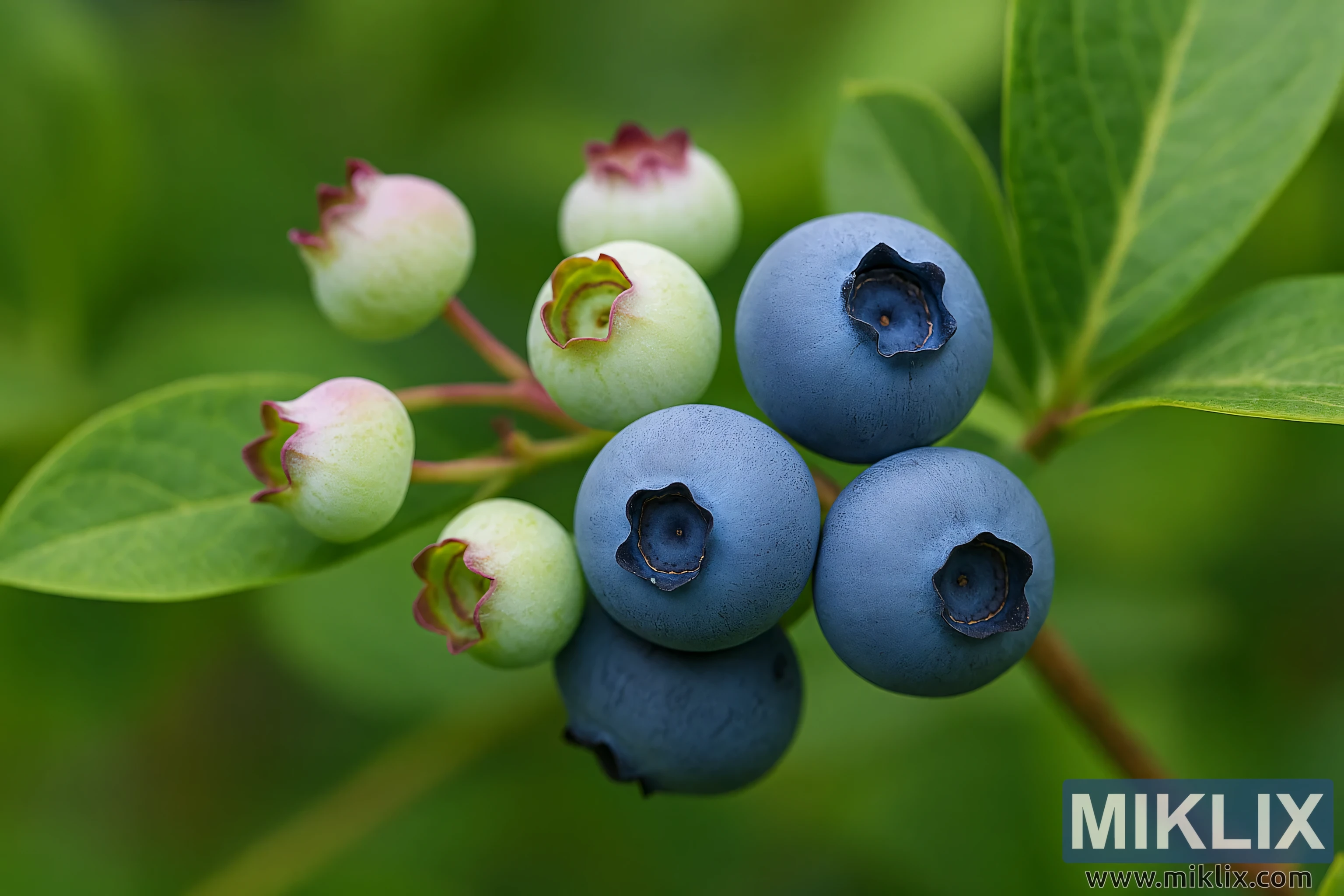 Phía trước, ba quả việt quất chín mọng chiếm trọn khung cảnh. Những quả mọng này mang sắc xanh thẫm như nhung với lớp hoa bụi đặc trưng, tạo nên lớp nền hơi lì. Mỗi quả chín đều được bao phủ bởi một đài hoa nhỏ, khô—màu nâu sẫm, hình ngôi sao—tạo thêm nét tương phản và điểm nhấn thú vị. Hình dáng tròn đầy đặn của chúng cho thấy độ chín hoàn hảo và sẵn sàng cho thu hoạch.