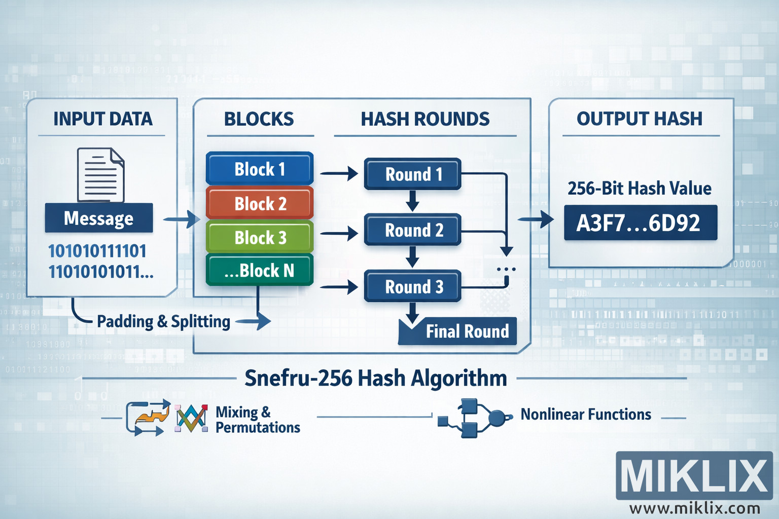 Hình ảnh là một đồ họa thông tin khổ ngang rộng, trực quan giải thích quy trình hoạt động cấp cao của thuật toán băm mật mã Snefru-256 mà không cần dựa vào các chi tiết triển khai dễ bị lỗi. Nền là một dải màu xanh nhạt mềm mại với các lưới mờ, chữ số nhị phân và các mẫu kỹ thuật trừu tượng gợi ý về quá trình xử lý dữ liệu. Từ trái sang phải, sơ đồ được chia thành bốn phần lớn được kết nối bằng các mũi tên đậm, tạo thành một quy trình rõ ràng.