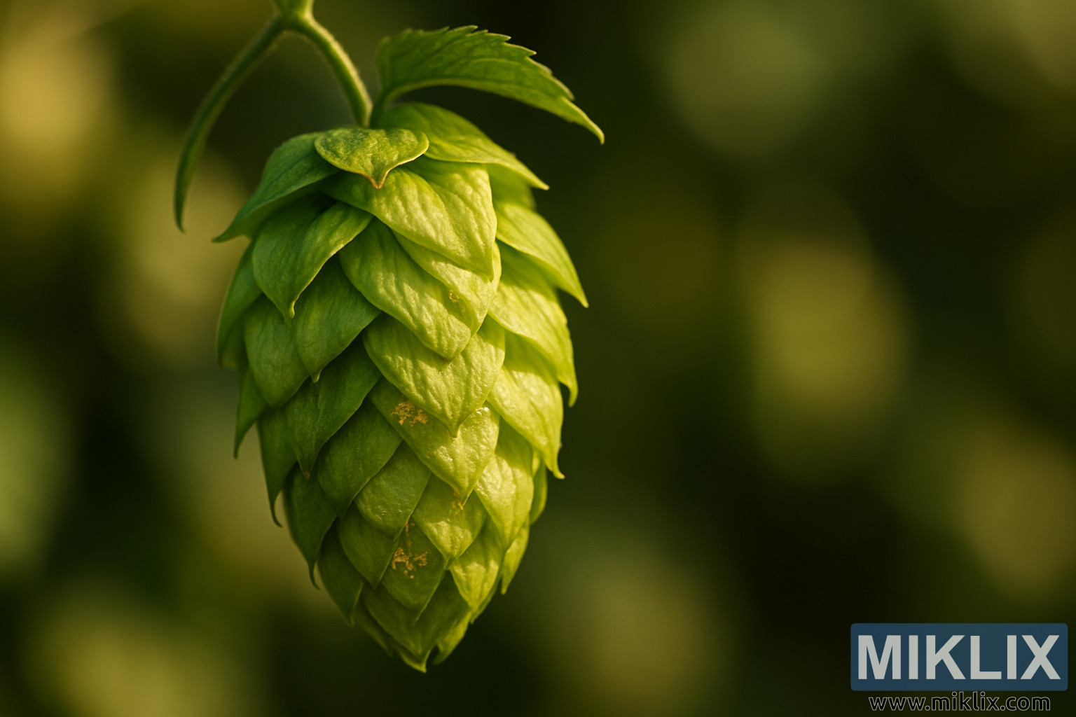Hình ảnh trình bày một góc nhìn cận cảnh cực kỳ chi tiết về một nón hoa bia Cicero được chụp từ một góc hơi cao, cho phép người xem đánh giá đầy đủ cấu trúc lớp và sự phức tạp tự nhiên của hoa bia. Mỗi lá bắc chồng lên lá tiếp theo theo cách sắp xếp xoắn ốc, tạo thành một hình nón nhỏ gọn nhưng tinh tế, trông gần như có tính kiến trúc trong độ chính xác của nó. Màu xanh lá cây rực rỡ của nón hoa bia trải dài từ màu xanh lá cây vàng nhạt, có ánh nắng gần đầu cánh hoa đến các tông màu đậm hơn, bão hòa hơn gần lõi hơn, tạo ra một gradient thị giác động làm tăng cảm giác ba chiều. Ánh sáng mặt trời ấm áp, tự nhiên tắm trong nón, tạo ra những bóng đổ mềm mại, có định hướng làm nổi bật kết cấu của các lá bắc mỏng manh như giấy. Bề mặt của mỗi lá bắc cho thấy các họa tiết giống như gân và gợn sóng tinh tế, cho thấy bản chất mỏng manh nhưng kiên cường của các lớp bảo vệ của cây.