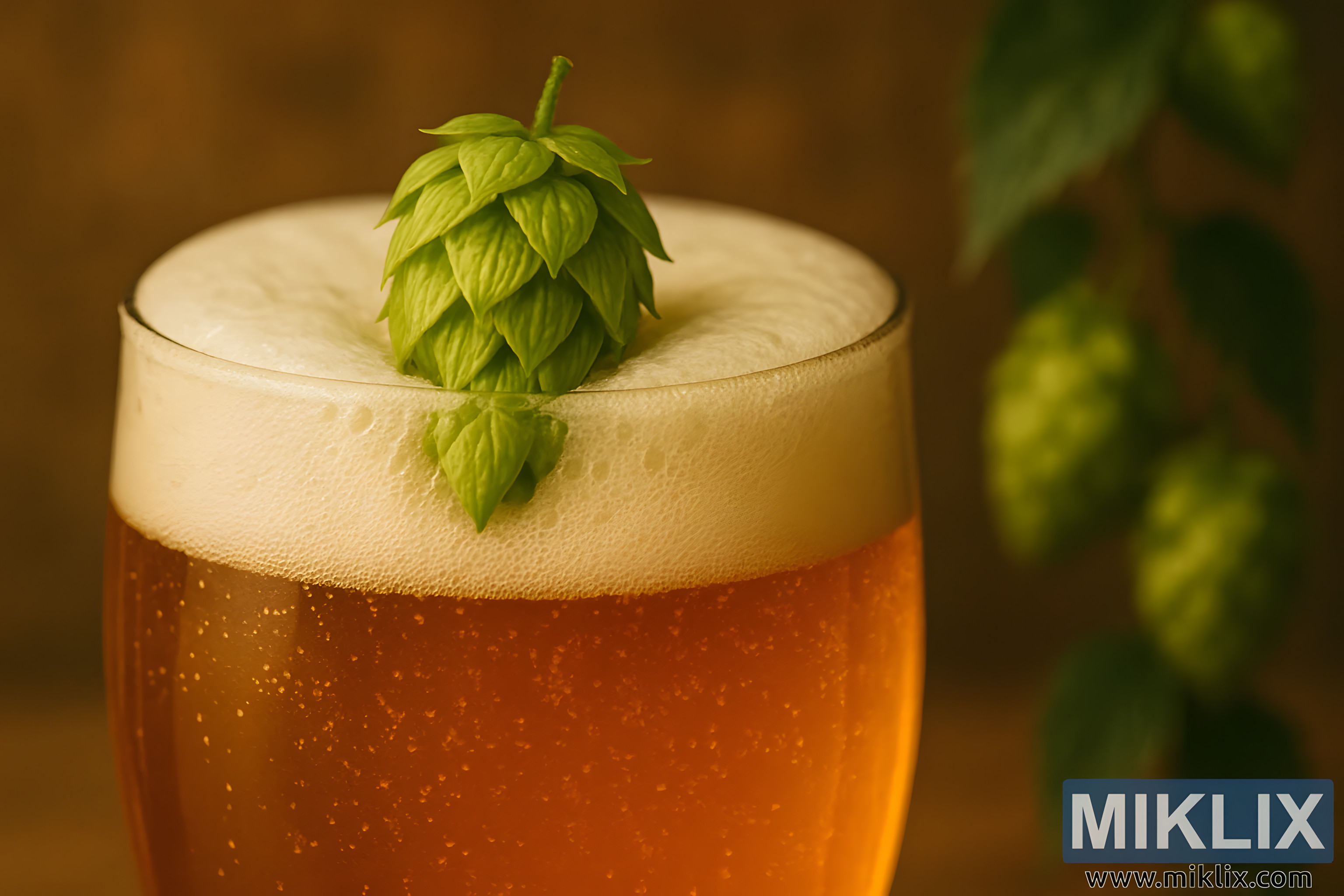 Bức ảnh chụp cận cảnh một ly bia thủ công mới rót, đầy không khí và gợi cảm, được tô điểm bằng một nón hoa bia Cobb rực rỡ, nổi trên lớp bọt kem mịn. Bản thân bia tỏa sáng với màu vàng hổ phách, rạng rỡ và ấm áp dưới ánh sáng dịu nhẹ của bối cảnh phòng thử rượu. Những bọt sủi bọt nhẹ nhàng nổi lên trong chất lỏng, bắt và phản chiếu ánh sáng, làm tăng thêm độ trong và sống động của bia. Tông màu hổ phách chuyển đổi tinh tế giữa vàng và mật ong đậm, gợi lên sự tươi mát và chiều sâu của hương vị. Bề mặt của bọt dày, mịn và hấp dẫn, với những bong bóng nhỏ, tinh tế tạo cho nó một kết cấu kem. Nằm ở giữa là nón hoa bia, một yếu tố màu xanh lá cây tươi mát nổi bật ngay lập tức thu hút ánh nhìn.