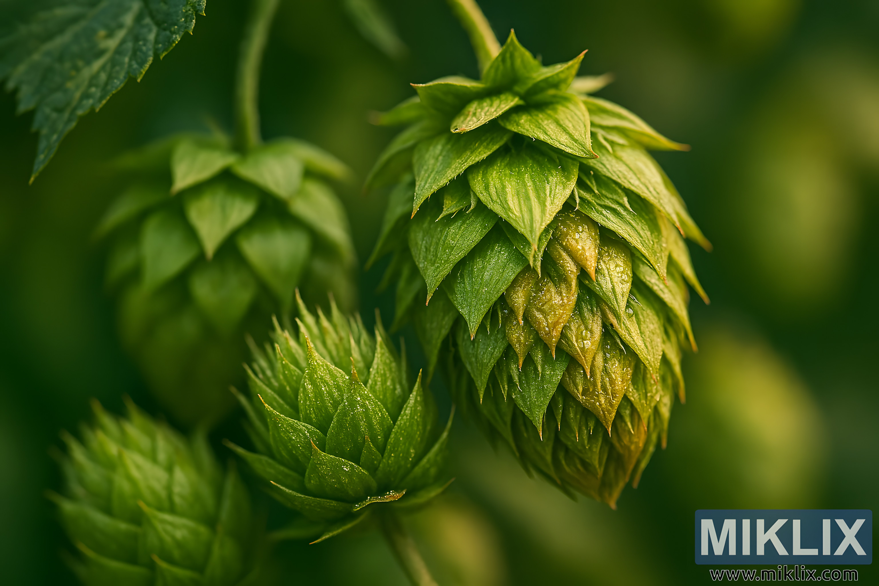 Ở tiền cảnh, ba nón hoa bia chiếm ưu thế trong khung hình, mỗi nón đều được thể hiện với độ rõ nét và chiều sâu đặc biệt. Nón trung tâm nằm hơi lệch về bên phải và rất sắc nét, để lộ những lá bắc xếp chồng khít nhau với sắc xanh lá cây rực rỡ. Những lá bắc này cong nhẹ ra ngoài, tạo thành hình nón nhọn hoắt, gợi lên sự phức tạp nhiều lớp của nón. Giữa các lá bắc, các tuyến lupulin lấp lánh với tinh dầu vàng óng, kết cấu hơi trong mờ của chúng bắt sáng và gợi lên sức mạnh sinh hóa bên trong.