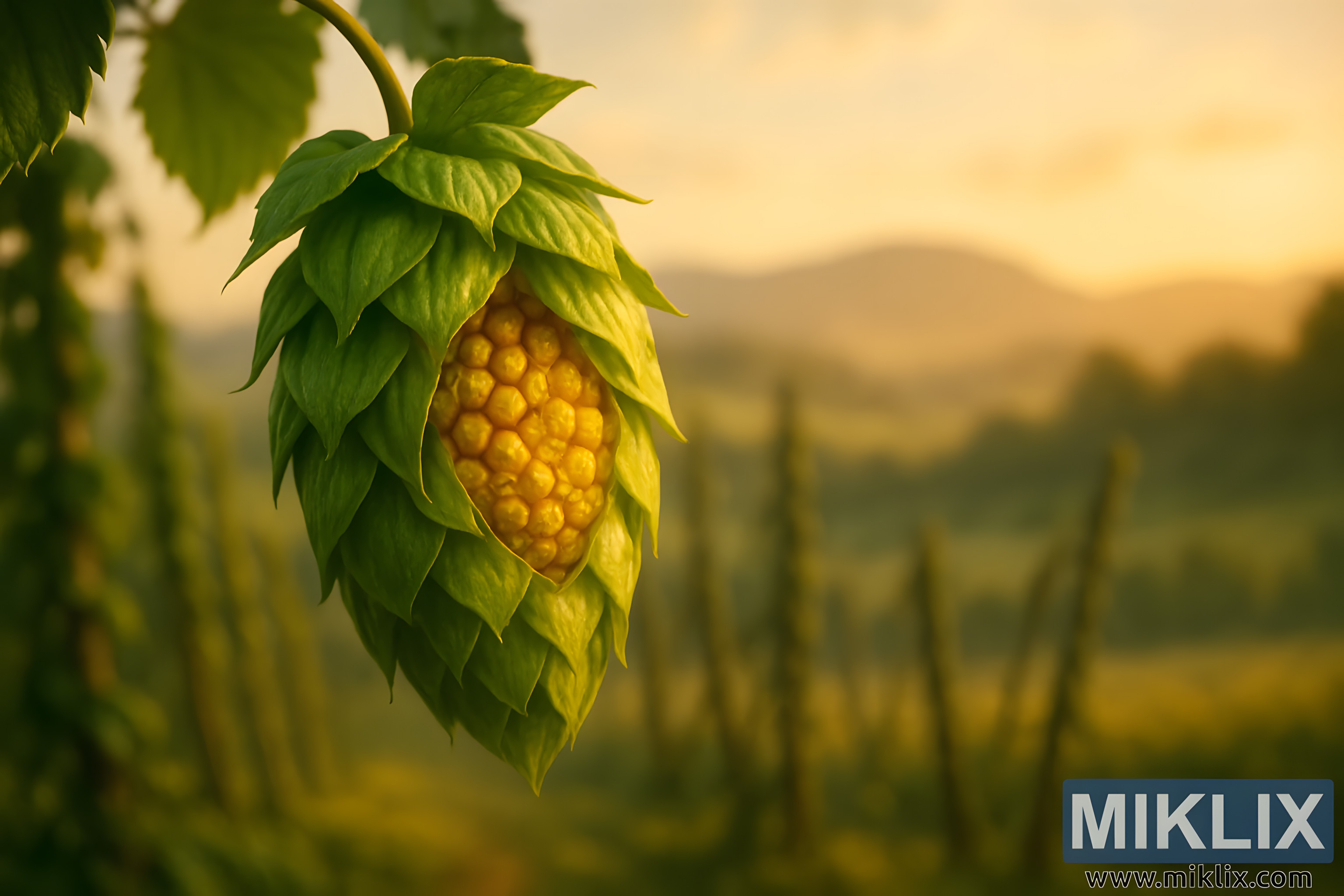 Hình ảnh thể hiện một hình ảnh nổi bật, gần như thơ mộng về một nón hoa bia lơ lửng trong ánh sáng vàng của buổi chiều muộn, hình dạng của nó thống trị tiền cảnh với các chi tiết thực vật phức tạp. Bản thân nón hoa bia được thể hiện với độ chính xác tỉ mỉ: các lá bắc của nó, có hình dạng như những chiếc vảy chồng lên nhau, có màu xanh lá cây tươi tốt, cong nhẹ ra ngoài và xuống dưới thành các tầng. Giữa các cấu trúc giống như lá này là phần lõi của nón, nơi các tuyến lupulin màu vàng lấp lánh như những cụm nhựa quý. Các tuyến này có kết cấu đầy đặn và giống như tổ ong, màu vàng kim của chúng phát sáng trên nền tương phản của các lá bắc màu xanh lá cây xung quanh. Chi tiết này mang lại cho nón một sự hiện diện gần như ngọc quý, thể hiện cả sức sống của cây và vai trò thiết yếu của nó trong sản xuất bia, nơi lupulin được đánh giá cao vì mang lại hương thơm, hương vị và vị đắng cho bia.