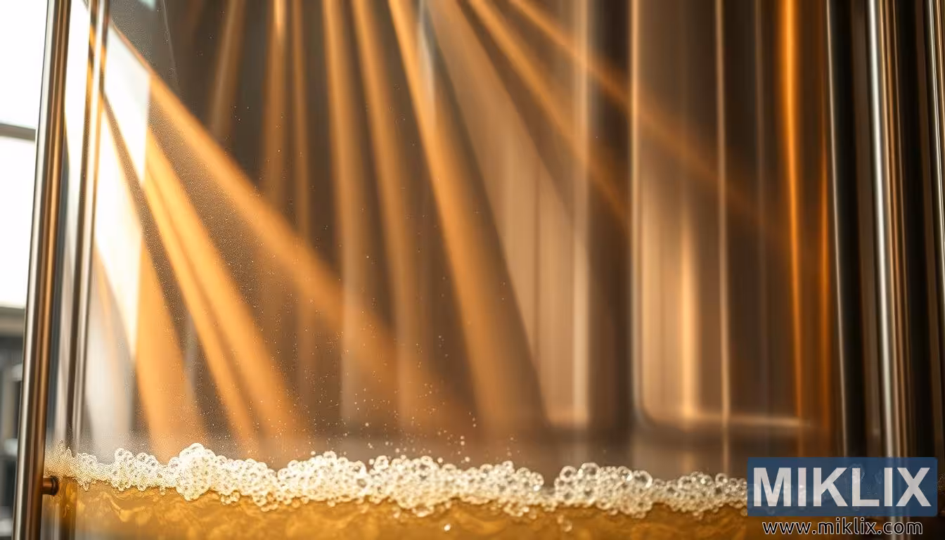 Bức ảnh này ghi lại khoảnh khắc chuyển mình sâu thẳm trong lòng một nhà máy bia thủ công hiện đại, nơi khoa học và nghệ thuật hòa quyện trong không gian tĩnh lặng, sủi bọt của một bể lên men bằng thép không gỉ. Góc nhìn cận cảnh mang đến một góc nhìn hiếm hoi, gần gũi qua một thùng chứa hình trụ trong suốt, hé lộ một chất lỏng vàng óng đang lên men. Bề mặt chất lỏng chuyển động sống động—những bong bóng nhỏ li ti nổi lên thành dòng đều đặn, tạo thành một lớp bọt mỏng manh bám vào thành chai và nhảy múa cùng ánh sáng. Sự sủi bọt này không chỉ mang tính thẩm mỹ; nó là minh chứng trực quan cho sức mạnh trao đổi chất của các tế bào nấm men, chuyển hóa đường thành cồn và carbon dioxide, một quá trình định hình nên linh hồn của việc ủ bia.
