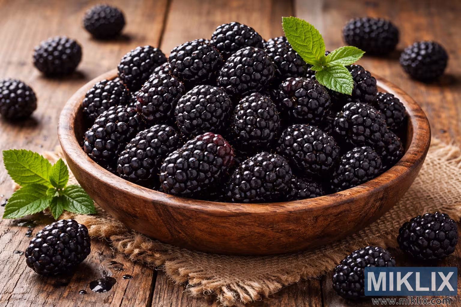 Fresh Blackberries in Rustic Wooden Bowl