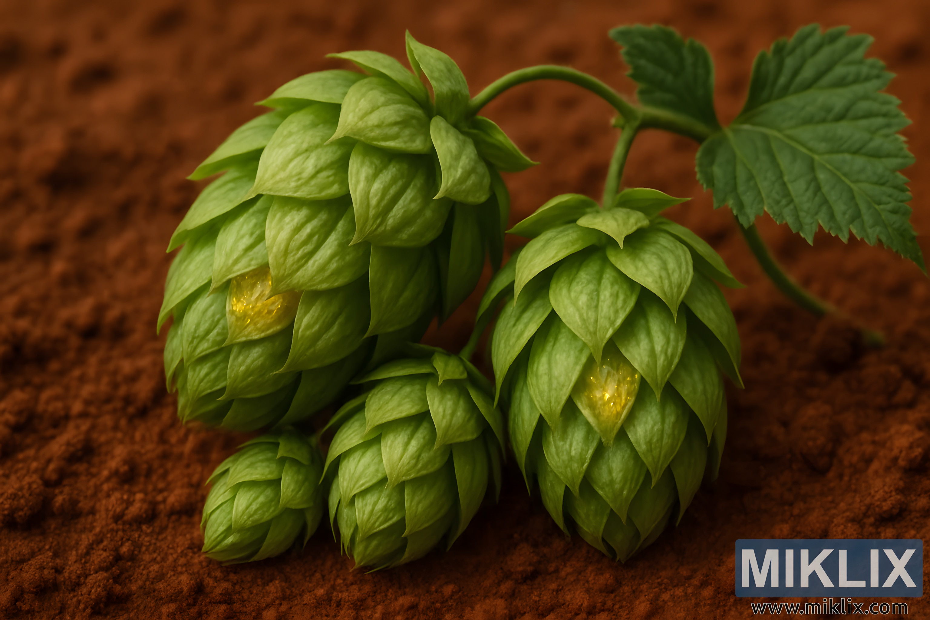鲜艳的啤酒花球果特写,在泥土般的红土上露出了金色的蛇麻素腺体,象征着自然的丰富和复杂的酿造风味。