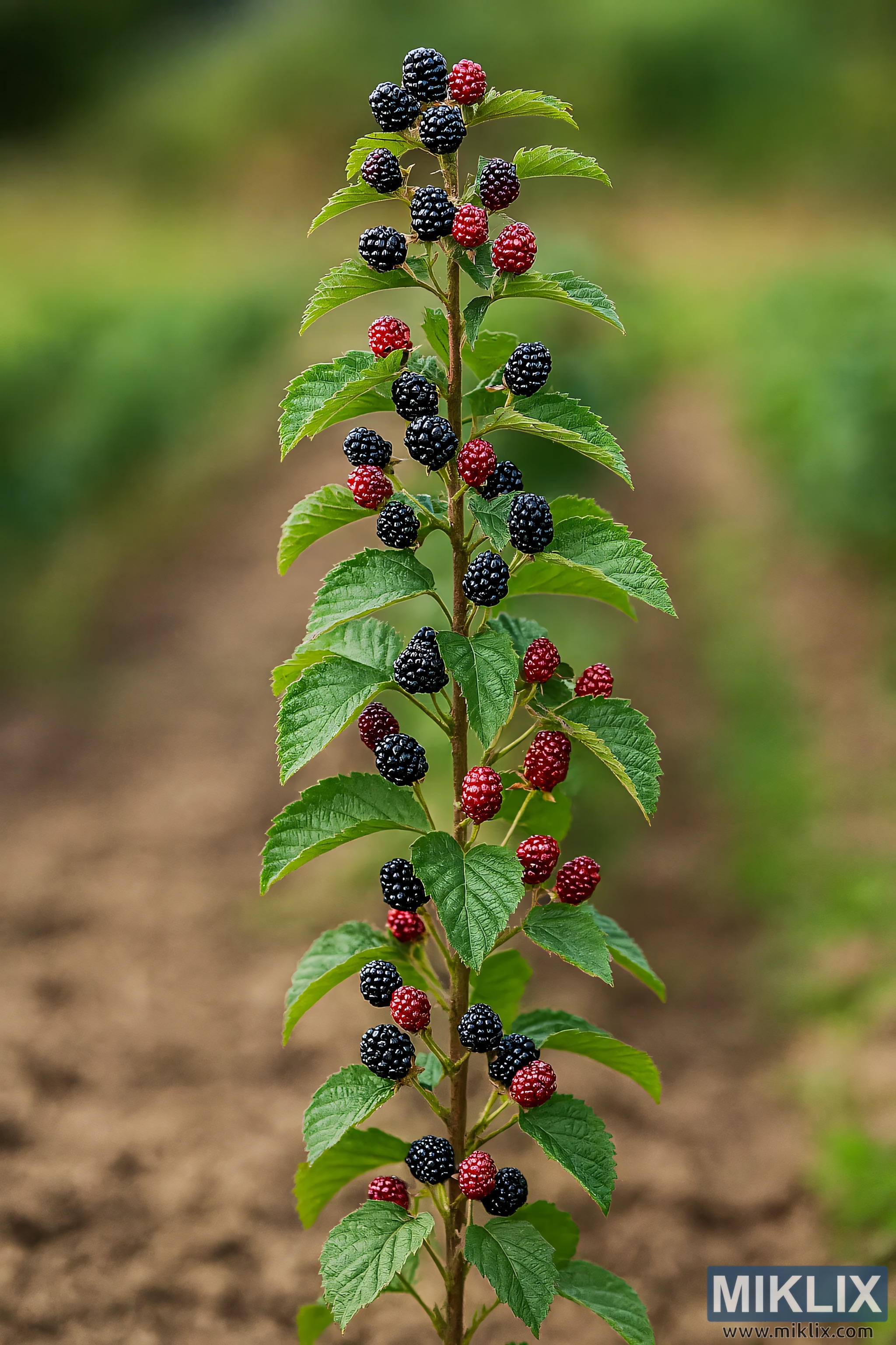 高分辨率图像显示,一株直立的黑莓植物在自然田野中无支撑地生长,展现出鲜艳的叶子和成簇的成熟和未成熟的浆果。