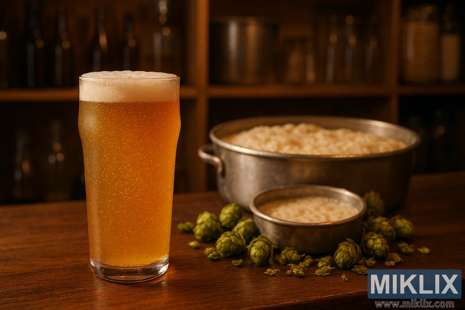 構圖略微傾斜,以強調深度和質感,引導觀者的視線從啤酒杯穿過發酵罐,最終到達遠處的架子。整體光線溫暖宜人,投射出柔和的陰影,突顯了木材、玻璃、金屬和有機原料的觸感。這幅作品讚頌了釀造的藝術性和科學性,以視覺敘事的方式,將技術上的真實感與氛圍上的魅力完美融合。