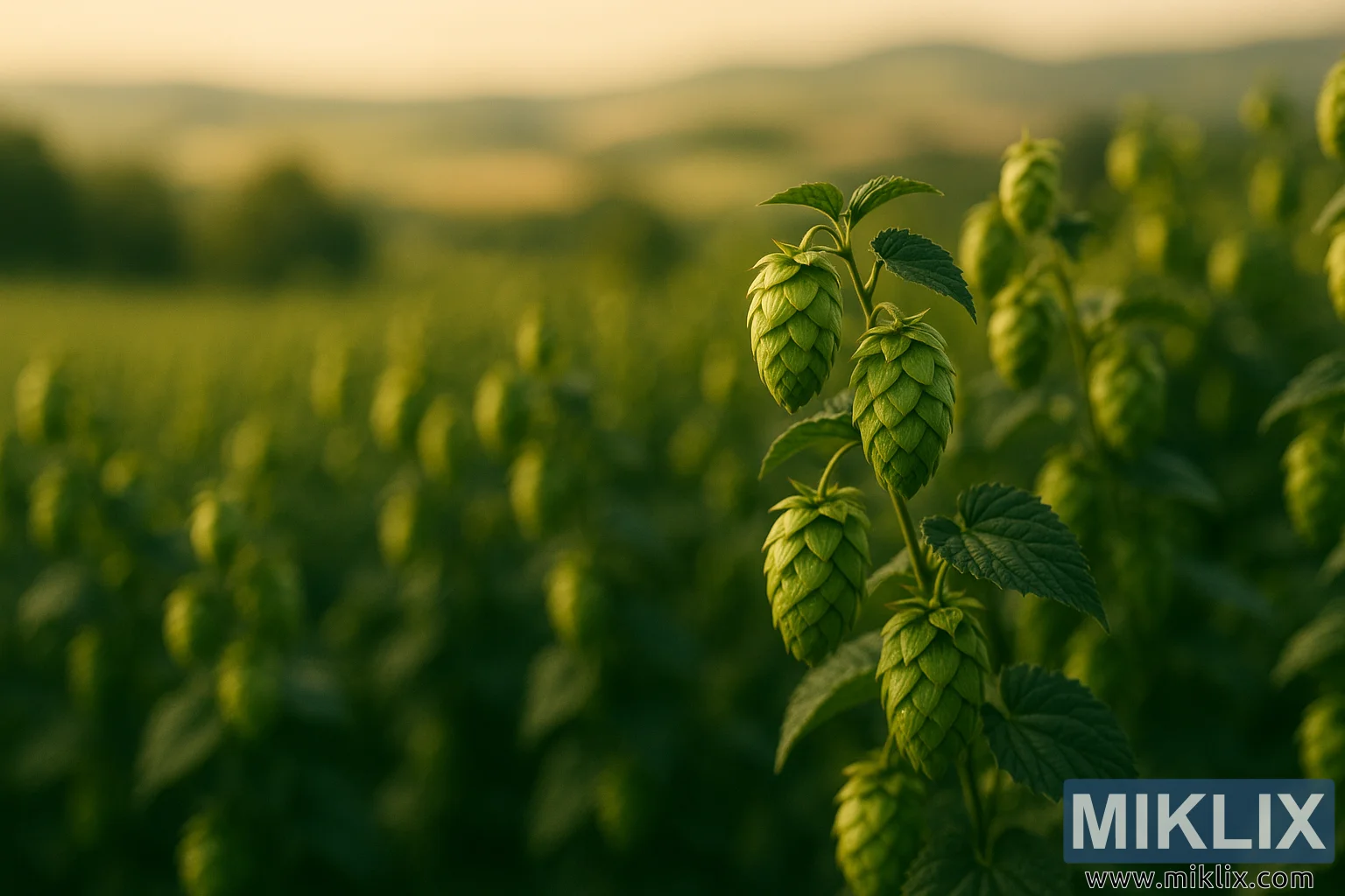 照片展現了一片寧靜祥和、陽光普照的啤酒花田,綿延在起伏平緩的丘陵地帶。前景中,幾顆清晰可見的啤酒花球果佔據了畫面中心,層層疊疊的苞片構成緊密的圓錐形,在溫暖的金光下熠熠生輝。每顆球果都呈現出濃鬱的翠綠色,細膩的紋理既展現出脆弱的一面,又蘊含著蓬勃的生命力。環繞球果的葉片清脆挺拔,邊緣鋸齒狀,在陽光的照射下閃爍著微妙的光影。
