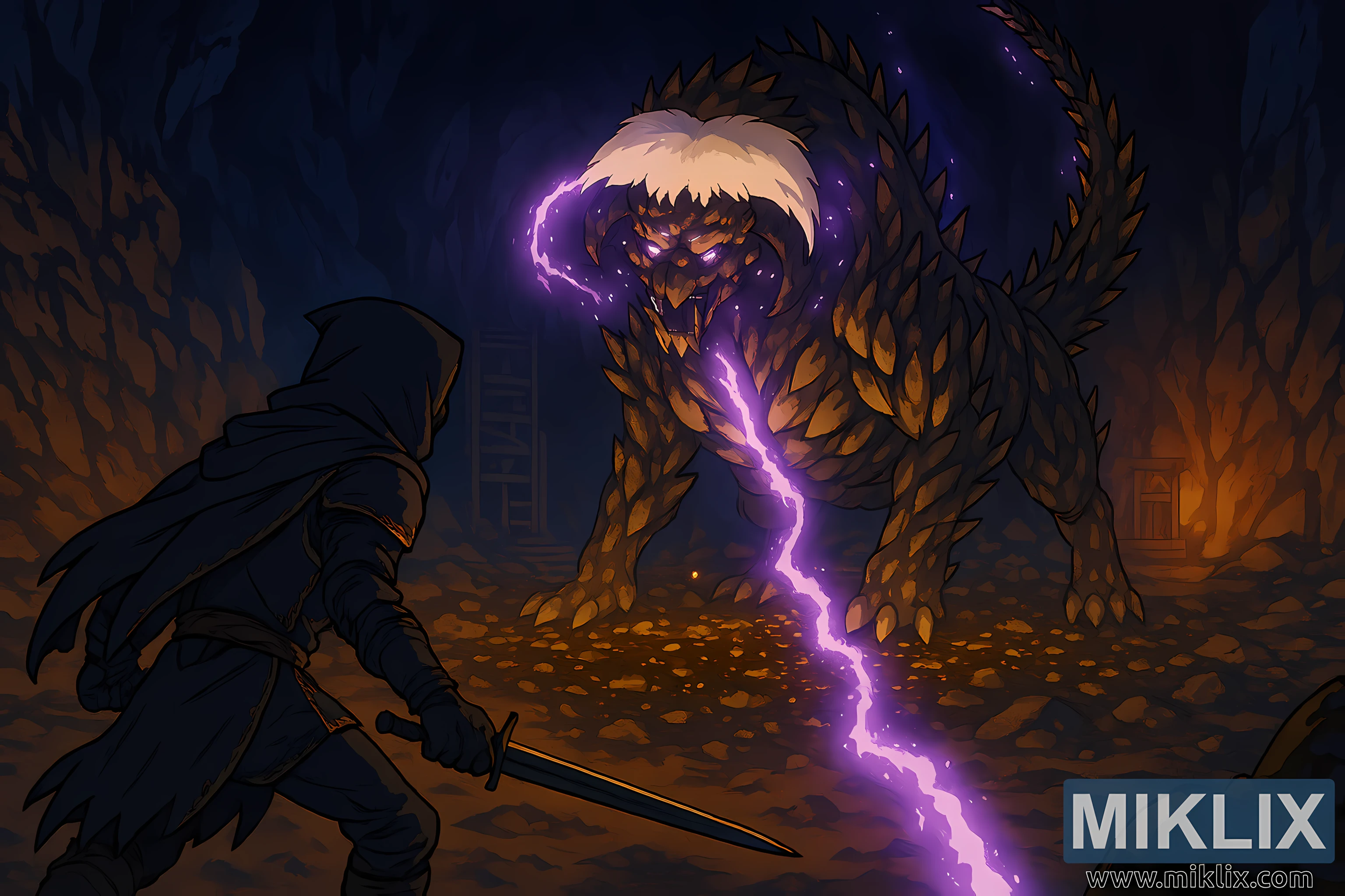 隕星巨獸佔據了畫面的右邊。它龐大的身軀覆蓋著鋸齒狀的金色棕色水晶鱗片,如同天然的武器般突出。濃密的白色鬃毛簇擁著它的頭部,部分遮蔽了它那散發著邪惡氣息的紫色雙眼。它張開血盆大口,露出一排排尖銳的牙齒。一條長長的尖刺尾巴在它身後向上彎曲,紫色的引力能量弧線在它周身劈啪作響,最終匯聚成一道閃電,從它的口中射向地面。閃電斜穿畫面,將岩石地面照亮成片的紫色光芒,並濺起金色的火花。
