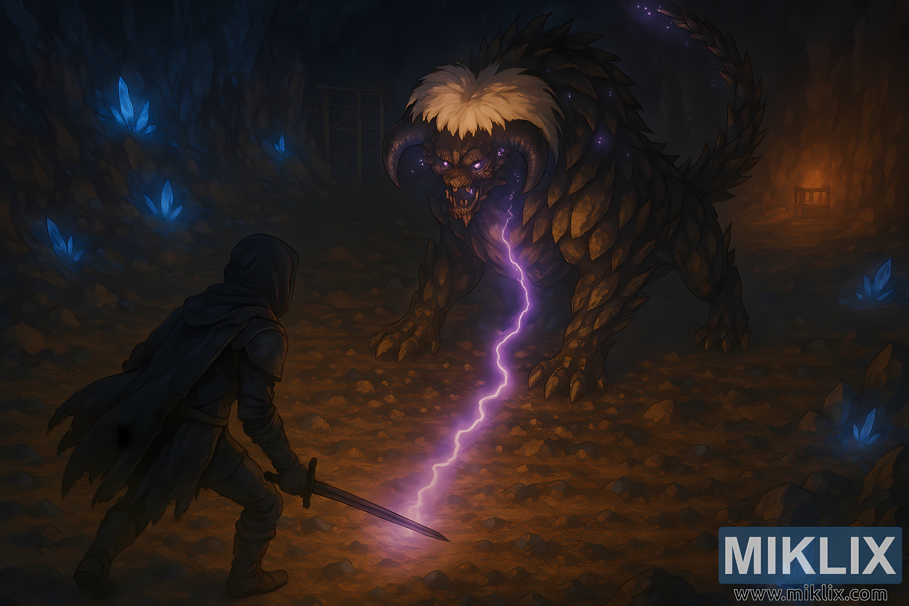 這生物佔據了畫作的右側,體型龐大,四足行走,全身覆蓋著鋸齒狀的金棕色晶體板。它的頭部長著濃密的白色鬃毛,與深色的岩石鱗片形成鮮明對比。這隻生物有著閃著紫光的眼睛,張開大嘴,露出尖銳的牙齒。它的尾巴很長,分節,佈滿尖銳的結晶棘刺,向上捲曲。一道劈啪作響的紫色能量光束從它的口中射向戰士附近的地面,照亮了洞穴的地面,使其散發出耀眼的光芒。
