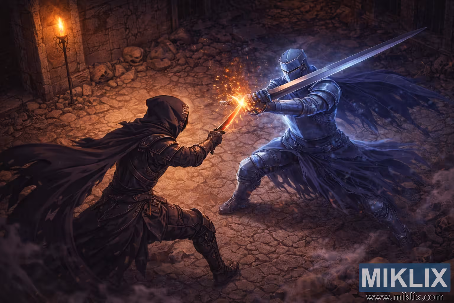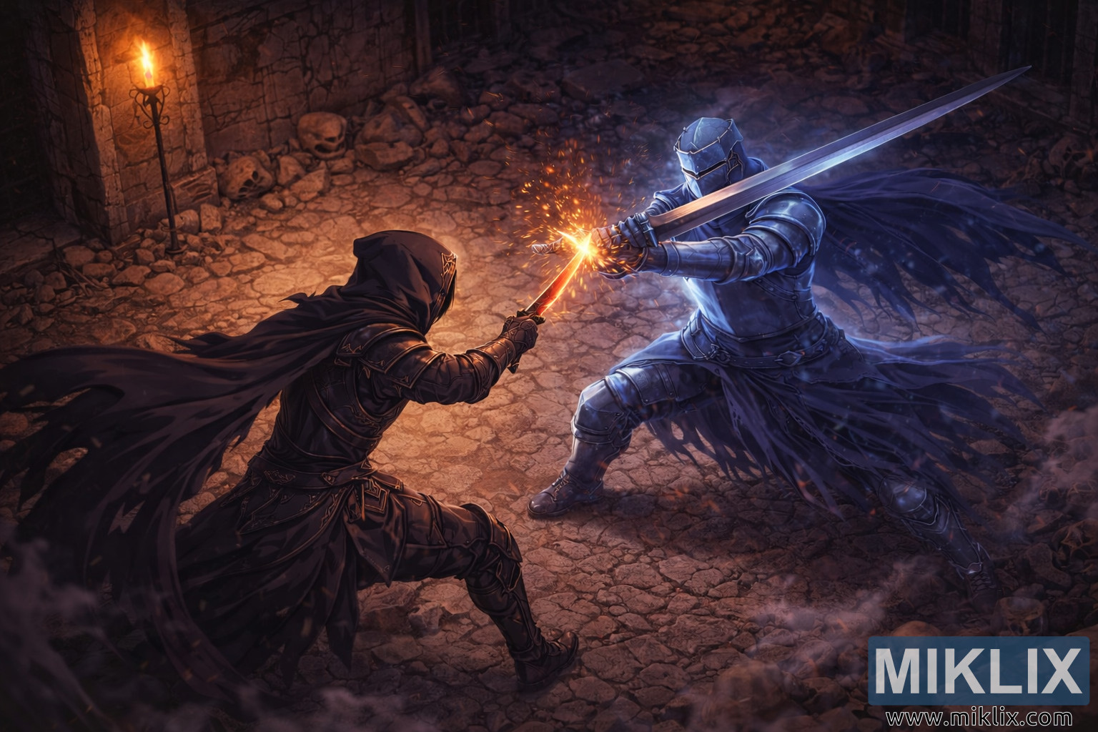 左上角石牆上的火炬,搖曳的琥珀色光芒灑滿地牢,為斑駁的石牆鍍上一層溫暖的光暈,與騎士冰冷的寒光形成鮮明對比。溫暖的火光、熾熱的火花和冰冷的藍色光暈交織在一起,在畫面中心營造出強烈的色彩張力。等距視角將這場決鬥轉化為一幅戰術圖景,使觀者能夠清晰地辨識出戰士們的位置和動作,彷彿親眼目睹了孤寂監獄深處一場至關重要的較量。