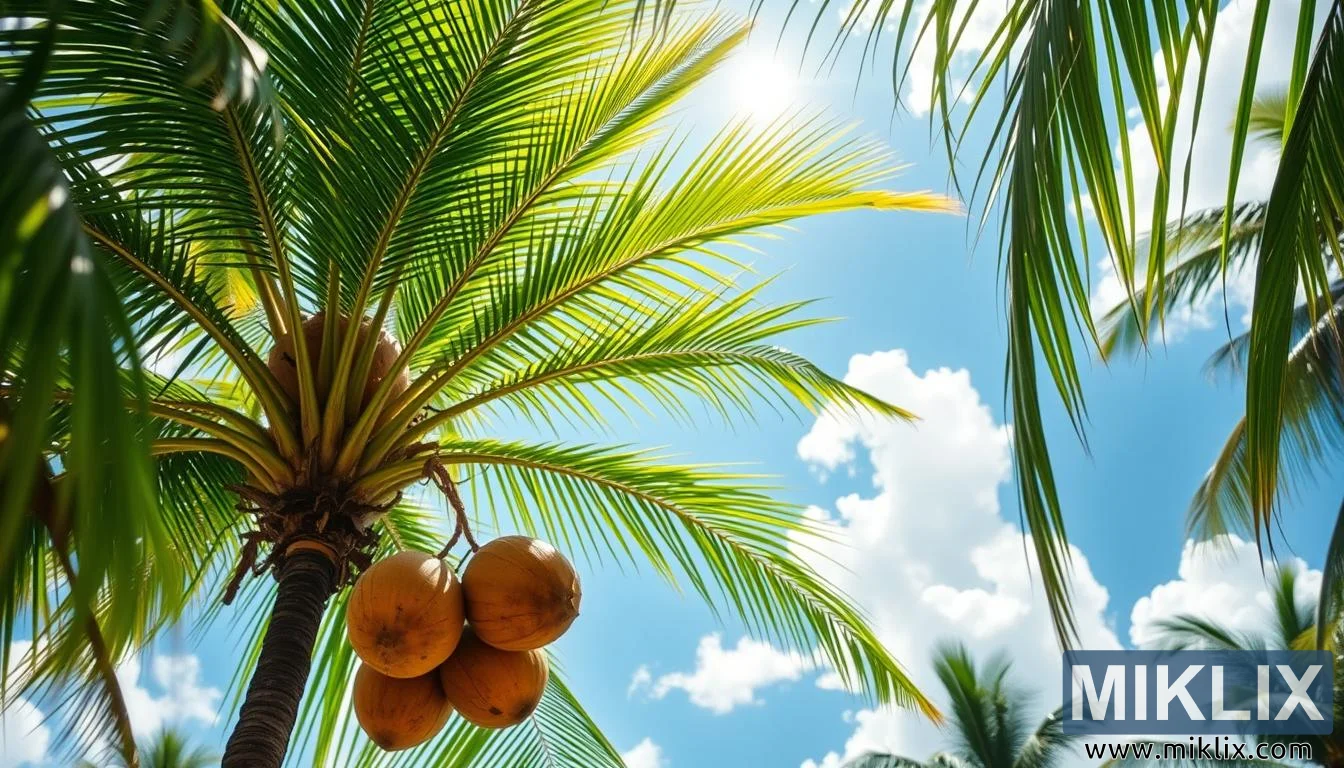 熱帶風光,有椰子樹、成熟的椰子和明亮的藍天,象徵寧靜、自然的恩賜和椰子的健康益處。