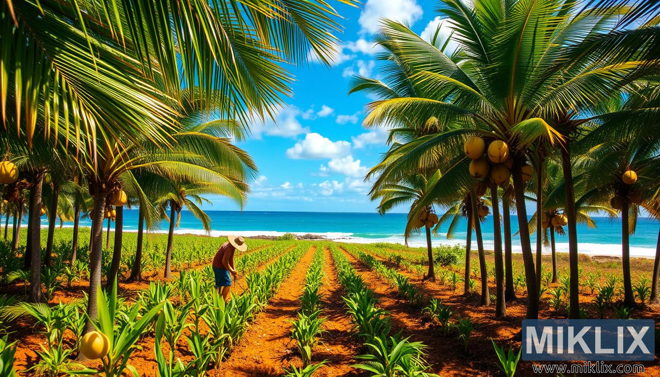 鬱鬱蔥蔥的椰子種植園,農民照顧幼苗,高大的棕櫚樹,成熟的椰子,以及海岸背景,象徵和諧與永續的耕作。