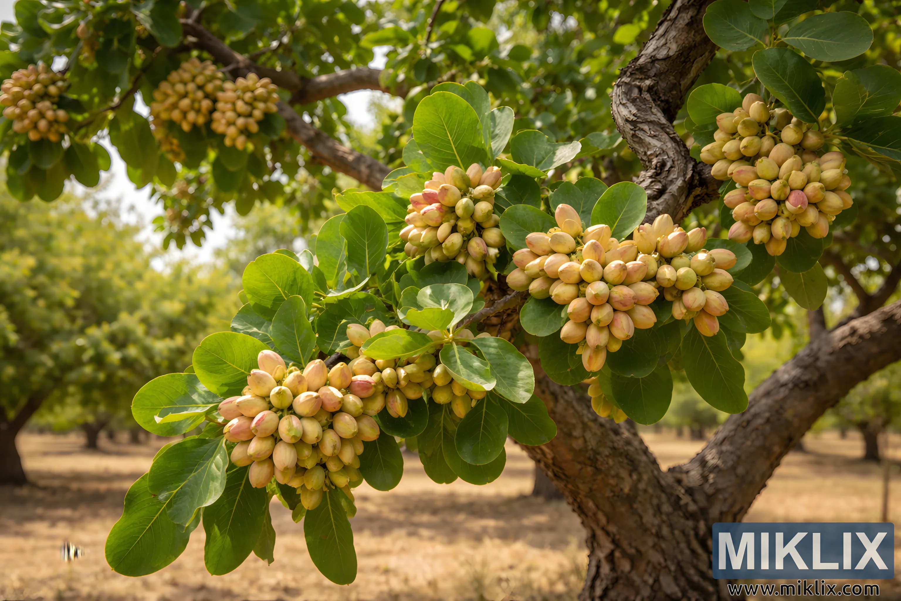 畫面中,一棵成熟的開心果樹在溫暖的自然光下生長於果園。粗壯虯曲的樹幹,紋理粗糙、飽經風霜的樹皮,斜穿過畫面,支撐著向外向上伸展的粗壯枝幹。枝幹上垂掛著許多簇正在發育的開心果,每簇都由數十顆緊密排列的橢圓形果殼組成。開心果的顏色略有不同,從淺綠到乳黃,並帶有淡淡的粉紅色,表明它們正處於成熟階段。環繞著開心果簇的是寬大而革質的葉片,邊緣光滑,呈現濃鬱的綠色。葉片交疊,捕捉陽光,形成層疊的樹冠,過濾光線,在開心果和枝幹上投下柔和的陰影。背景中,果園一直延伸到遠方,排列著更多的開心果樹。這些背景樹木略微模糊,增強了畫面的景深,並突顯了前景中的主要物件。樹下的地面乾燥金黃,暗示這裡是典型的開心果種植區,氣候溫暖而半乾旱。整體構圖平衡了前景的清晰細節和柔和的背景,既突出了農業環境,又展現了開心果樹在果實發育旺盛期的自然之美。
