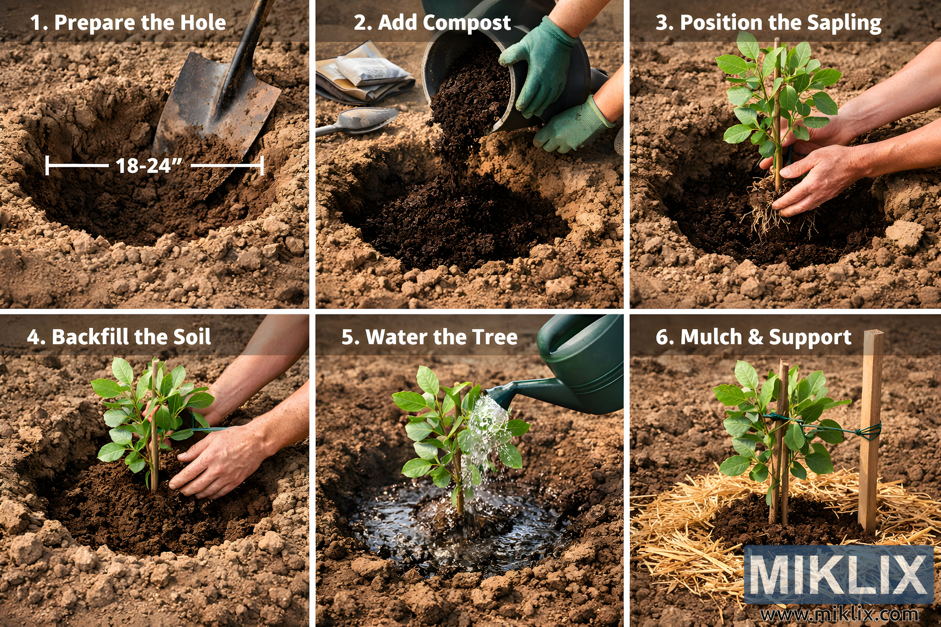 高解析度風景圖片展示了種植一棵幼小的開心果樹的完整步驟,包括土壤準備、堆肥、種植、澆水、覆蓋和支撐。