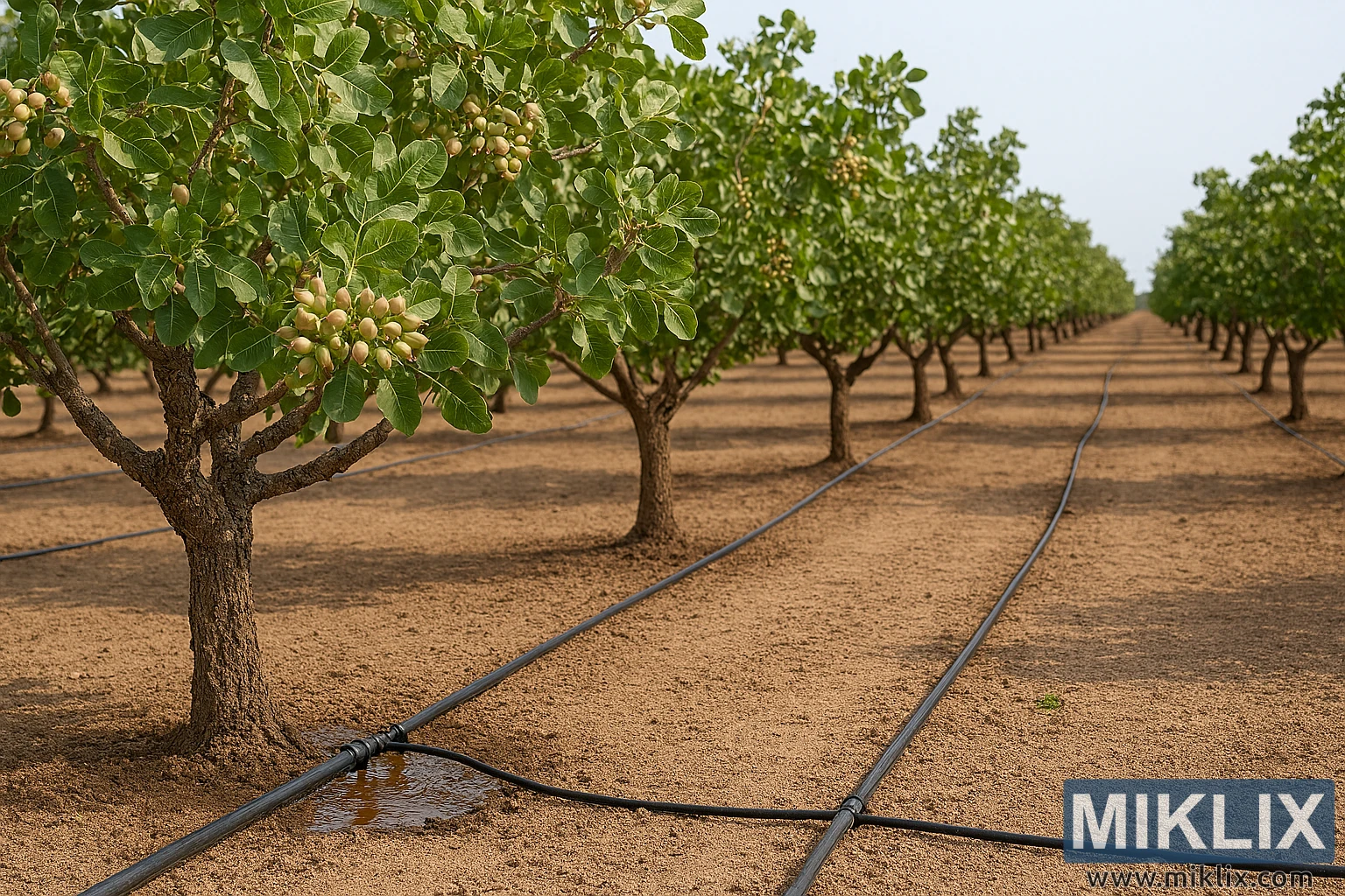 果園的土壤乾燥呈淺棕色,質地粗糙,略微結塊。土壤耕作良好,無雜物,行間僅零星分佈著一些低矮的雜草。地面大部分裸露,凸顯了開心果產區典型的乾旱氣候。每排樹木旁都平行鋪設著一條黑色聚乙烯滴灌軟管,略高於地面。從這些主管道延伸出較小的黑色軟管,直達每棵樹的根部,末端連接滴頭,持續地向樹木局部供水。