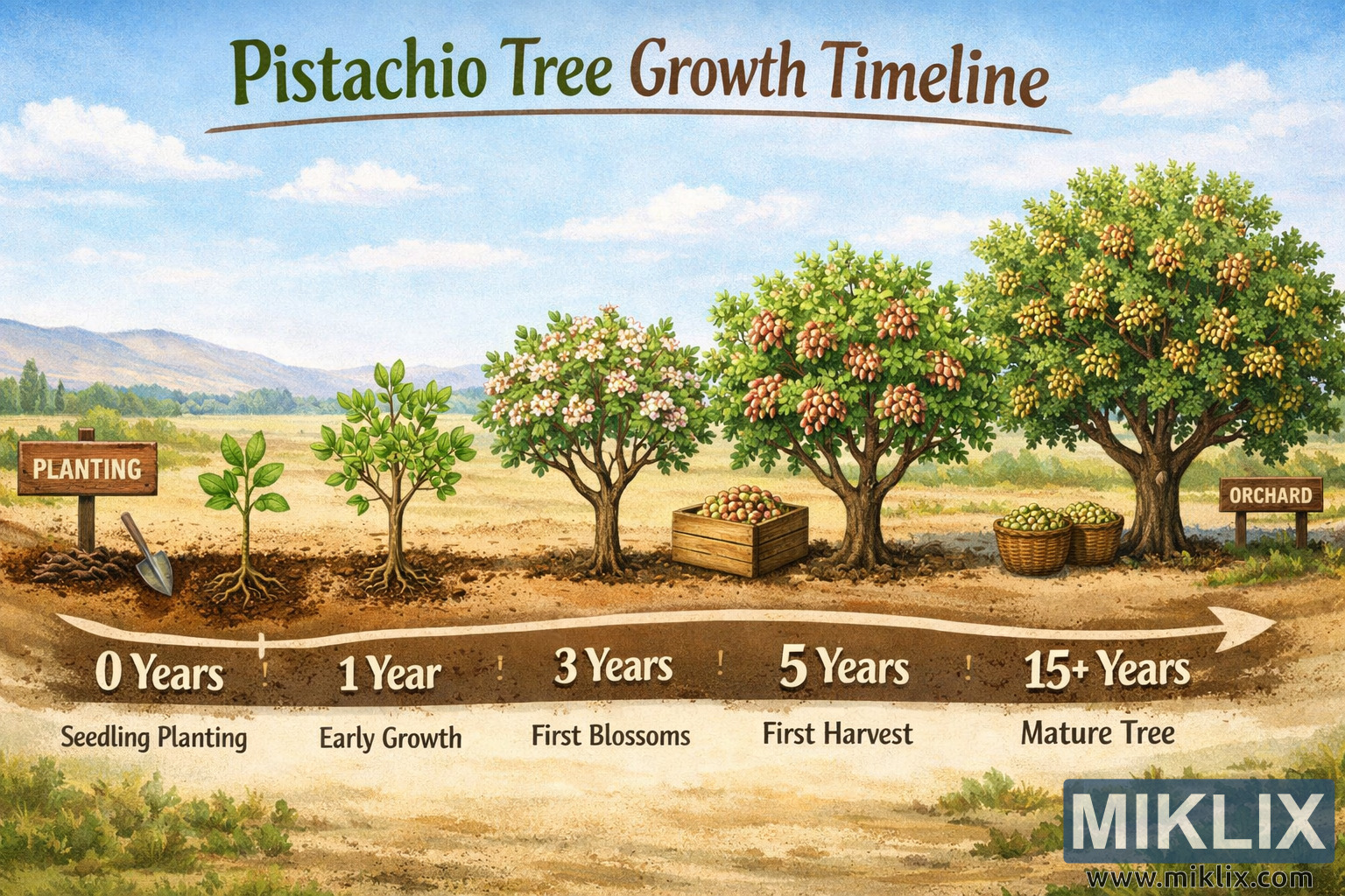 在整幅資訊圖表中,溫暖的大地色調與鮮明的綠色形成鮮明對比,清晰的字體和簡潔的圖標使時間軸易於理解。整體構圖兼具寫實性和圖示的清晰度,使其適用於教育用途、農業演示或有關開心果種植和樹木長期生長的說明材料。