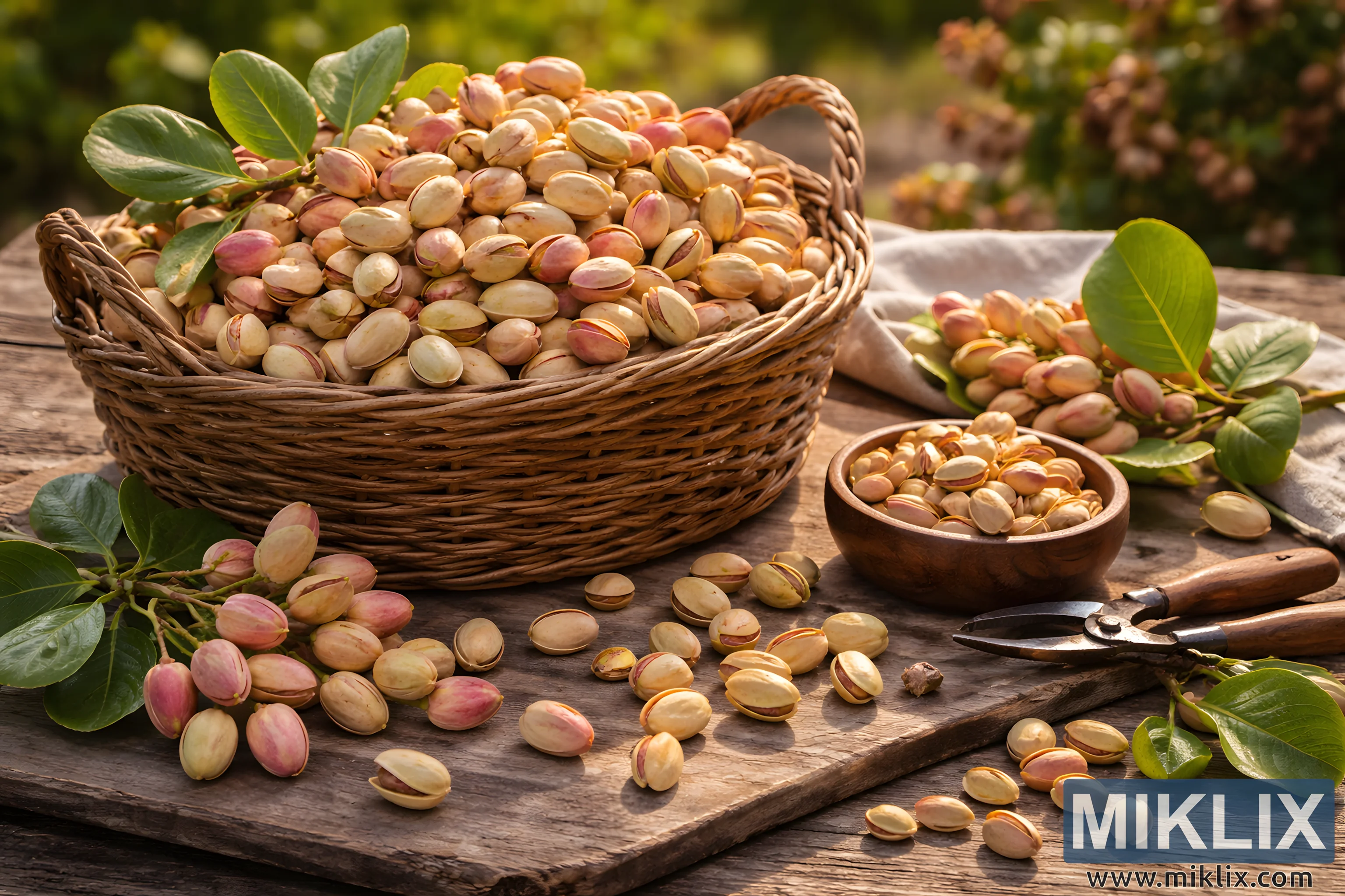 高解析度圖像展示了新鮮採摘的自家種植的開心果,它們被放置在柳條籃中,擺放在質樸的木桌上,周圍環繞著綠葉和園藝工具,沐浴在溫暖的自然光下。