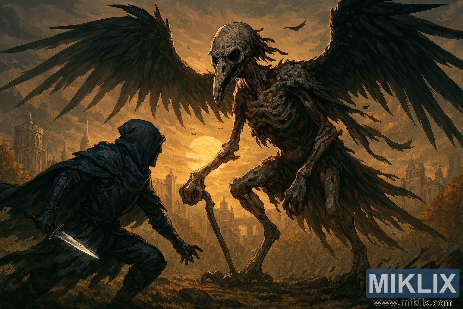 Ukwakhiwa kugcizelela umehluko phakathi kwe-Tarnished's sleek, shapey shadowy kanye ne-Deathbird's grotesque, skeletal bulk. Imigqa edayagonal edalwe ngamaphiko, inkemba, nezakhi zezakhiwo ziqondisa iso lesibukeli endaweni yesehlakalo. Ukukhanya kuyamangaza, ngokukhazimula kwenkemba nokushona kwelanga kuveza izithunzi ezinde futhi kugqamisa ukwakheka kwezembatho, izimpaphe, namathambo.