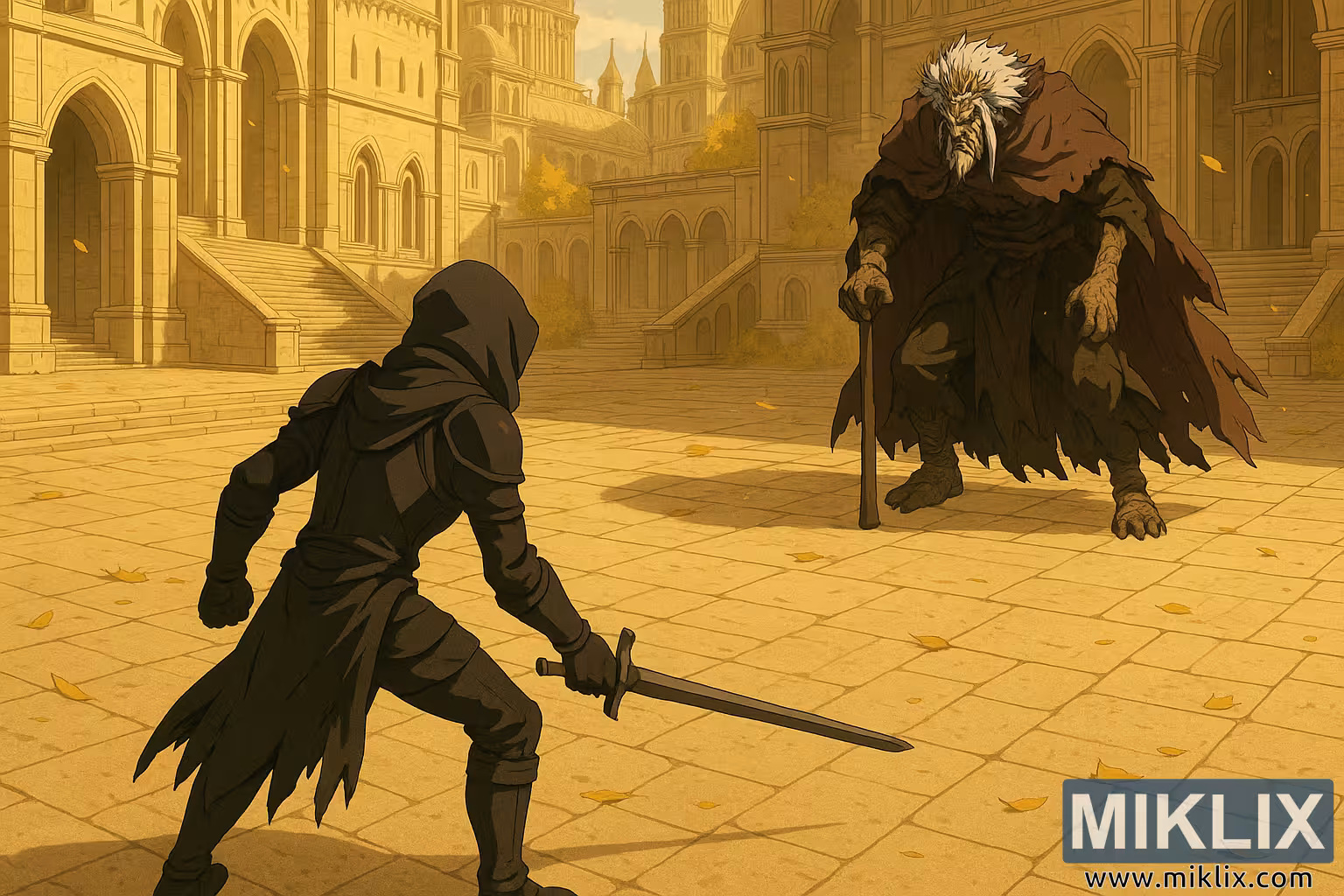 Isikhala phakathi kwalezi zibalo ezimbili - igceke elivulekile, elikhanyiswe yilanga futhi lithule - kudala ukungezwani njengokuphefumula. I-Tarnished ime phansi, igxilile, ayinyakazi. I-Morgott imibhoshongo ifana nesiphetho ngokwayo - yasendulo, ilimele, ayinakususwa. Umbukeli uzizwa emisiwe okwamanje ngaphambi kokunyakaza: ukubhekana ngokungenakugwemeka, okungenakuvinjwa, okulenga ekuthuleni kwezakhiwo zaphezulu nomoya ogcwele umlando.