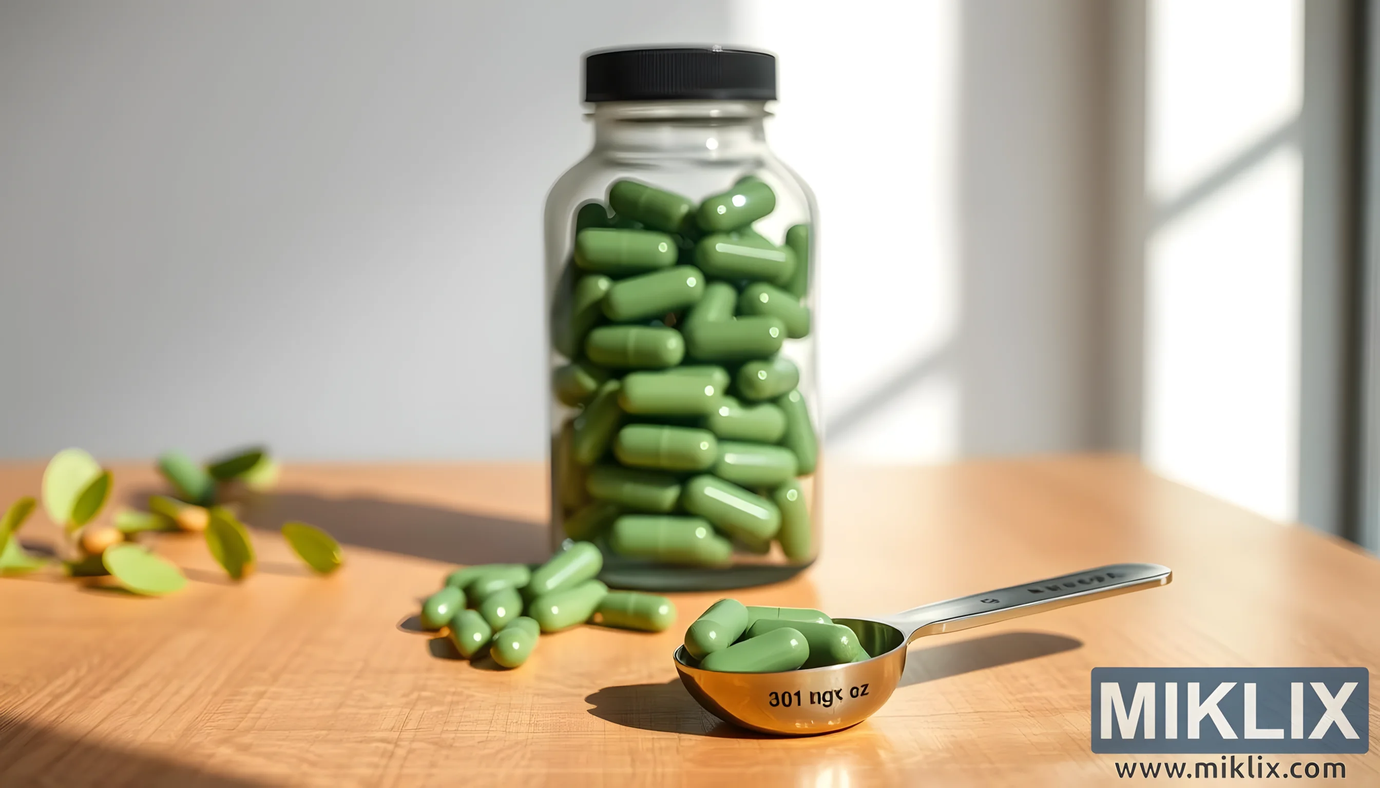 Ibhodlela lengilazi lamaphilisi e-Bacopa Monnieri anesipuni sokulinganisa etafuleni lokhuni, elifanekisela ukuphila kahle kwemvelo kanye nokusetshenziswa okufanele kwezithasiselo.