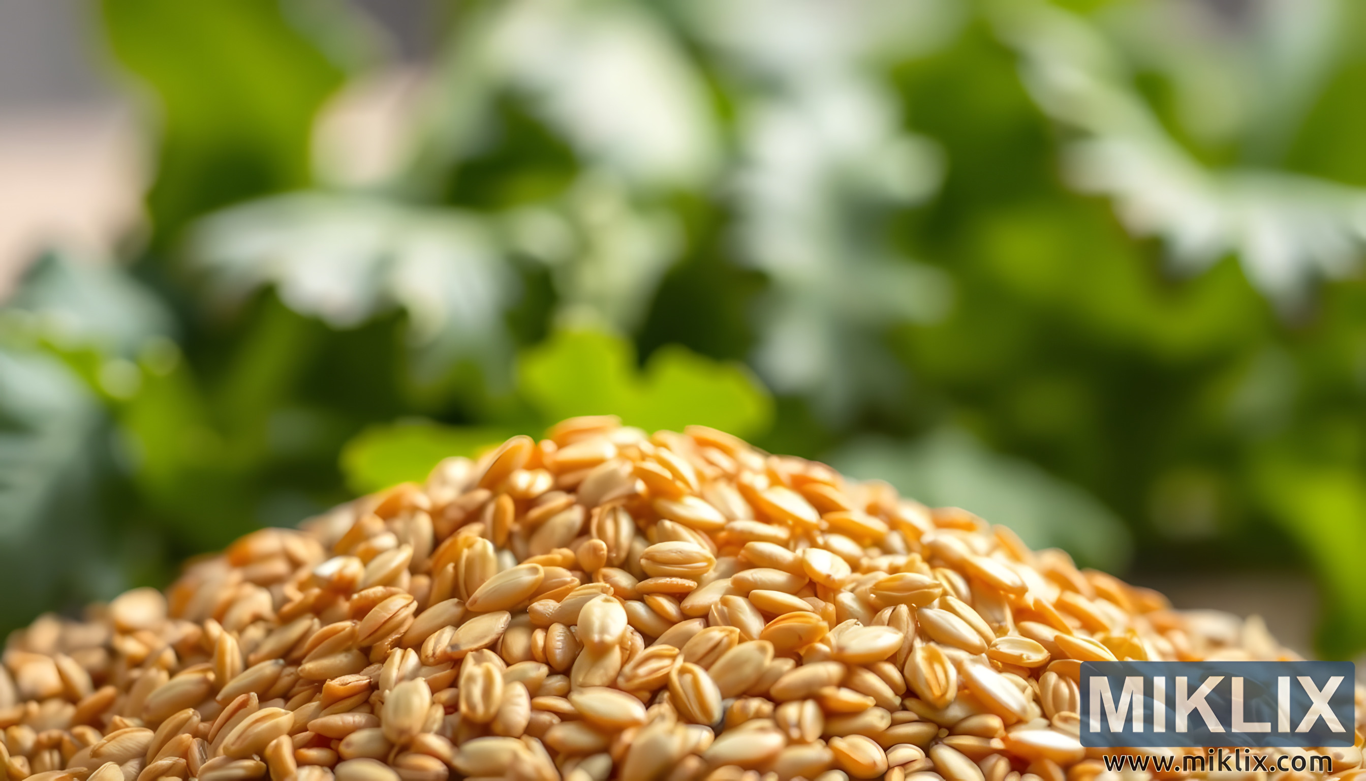 Kulesi sithombe, isibukeli sidonswa ngokushesha ngaphambili, lapho kuhlezi khona indunduma yezinhlamvu zefilakisi ezincane, ezicwebezelayo, amathoni azo ansundu ngokusagolide acwebezelayo njengoba ebamba ukukhanya. Imbewu yethulwa ngendlela yokuthi ukucwebezela kwayo kwemvelo kanye nezindawo ezibushelelezi zicishe zifane netshe eliyigugu, okubonisa umuzwa wobungqabavu nokondleka. Imbewu ngayinye yakheke kahle, inama-ridge acashile namakhonco agqamisa imininingwane eyinkimbinkimbi yalokhu kudla okulula kodwa okunamandla. Umthwebuli wezithombe ukhethe ukugxila ngokuqinile embewini ngokwazo, evumela izici zazo ezihlukile ukuthi zigujwe futhi zaziwe eduze, kuyilapho uhlaza olufiphale kancane ngemuva lunikeza ukuqhathanisa okuhambisanayo. Lokhu kulinganisela phakathi kwemininingwane ebukhali nokuthamba okumnene kudala ukwakheka okuvumelanayo, okuvusa ukuxhumana phakathi kwembewu, izitshalo, nomjikelezo obanzi wokuphila.