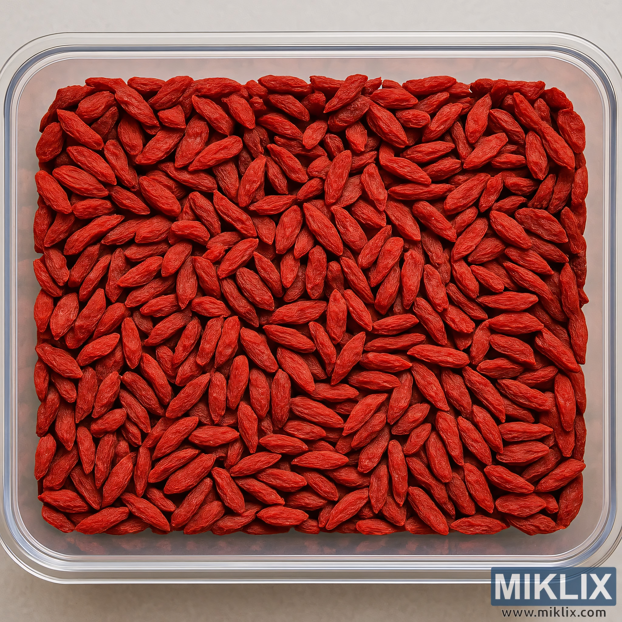 Isithombe esinokulungiswa okuphezulu kwamajikijolo omisiwe e-goji agcinwe esitsheni sepulasitiki esicacile, esibonisa umbala wawo obomvu ocebile kanye nendawo ebhaliwe ngokukhanya okulinganayo.