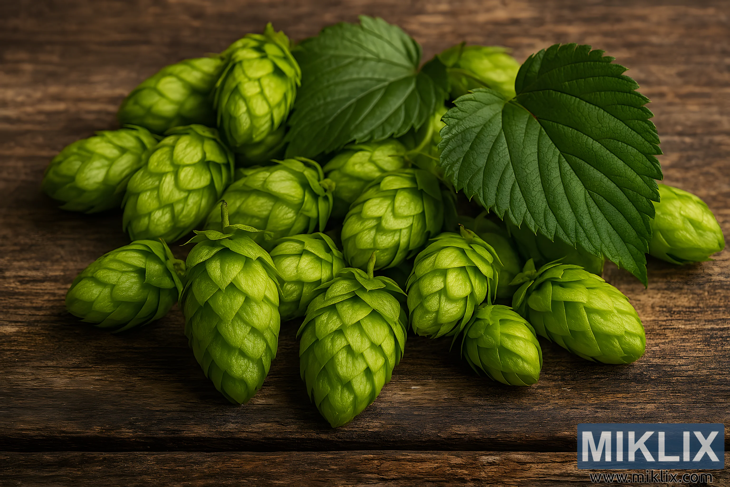 Phakathi kwama-cones kunamacembe amaningana amakhulu e-hop, aluhlaza ngokujulile ngombala anemiphetho egobile kanye nemithambo egqamile. Lawa mahlamvu engeza umehluko wezitshalo kanye nomongo, oqinisa ubusha besivuno. Iqabunga elilodwa ikakhulukazi, elibekwe eduze kwaphezulu kwesokudla sohlaka, ligoba kancane phezu kwamakhoni, indawo yalo icwebezela kancane futhi igcwele ukukhanya.