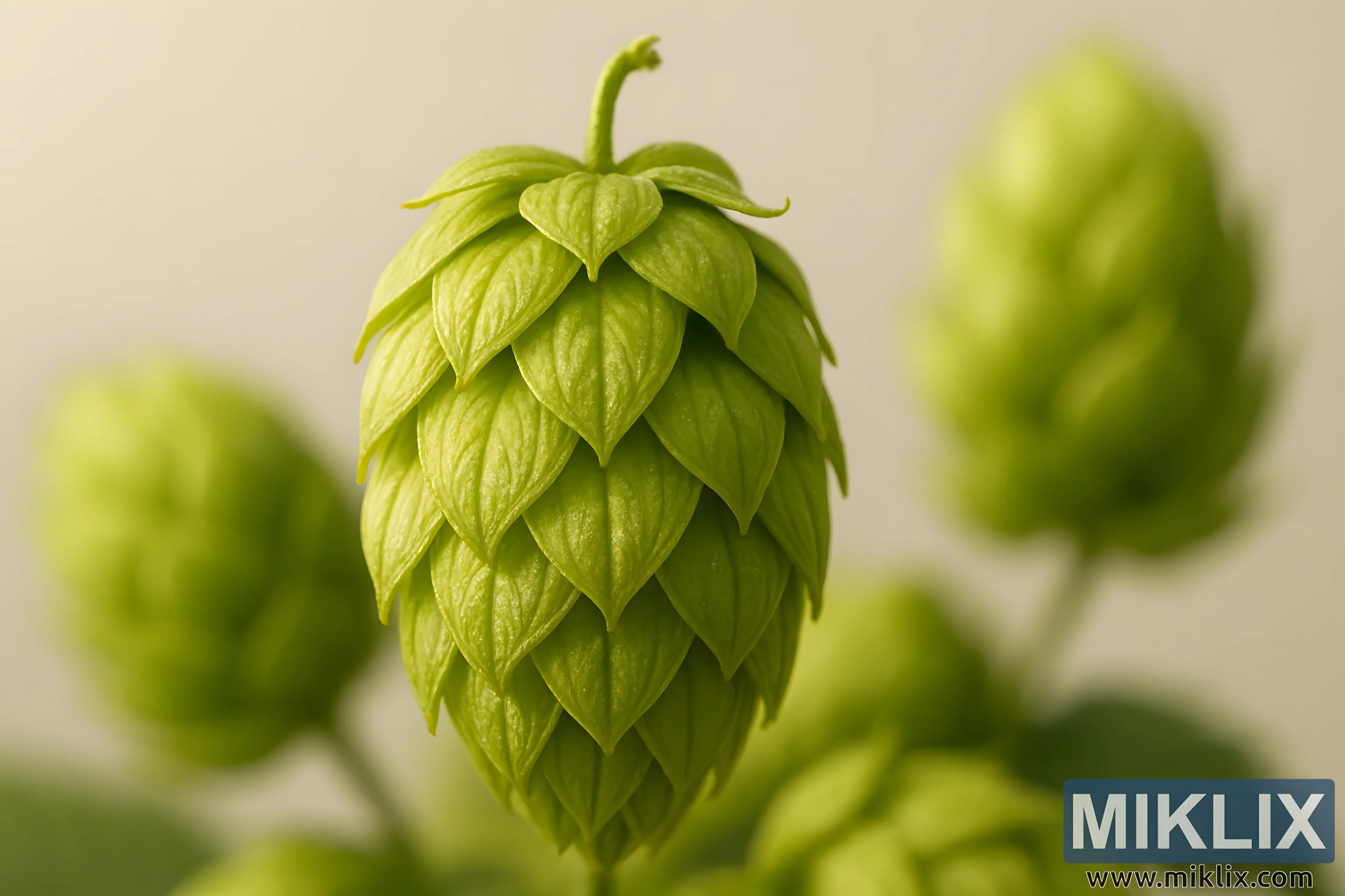 Isithombe sinikeza isithombe esisondelene sesinye sezithako ezibaluleke kakhulu zokuphisa: i-hop cone. Lapha, ukugxila kudonswa ngokuqinile ku-Admiral hop eyodwa, elenga ngokucaca okucijile ngokumelene nengemuva elithambile, elifiphele eligqamisa isimo nombala wayo. Ikhoni ngokwayo iyisimangaliso sejiyomethri yemvelo, ama-papery bracts agqinsile ngokulingana okuphelele, agqagqene njengezikali ezintekenteke ocezwini lwezikhali zezitshalo. Isigaba ngasinye siholela iso phansi endaweni egelezayo yohlaza, ifinyelela umvuthwandaba endaweni eyindilinga ekhuluma ngokuphelela nokuvuthwa. Ama-bracts agqamile futhi aluhlaza, ubuso bawo wenziwe ngendlela efiphele, abamba ukukhanya ezithombeni ezinhle kakhulu ezibonisa izindlala ze-lupulin esagolide ezifihlwe ngaphakathi.