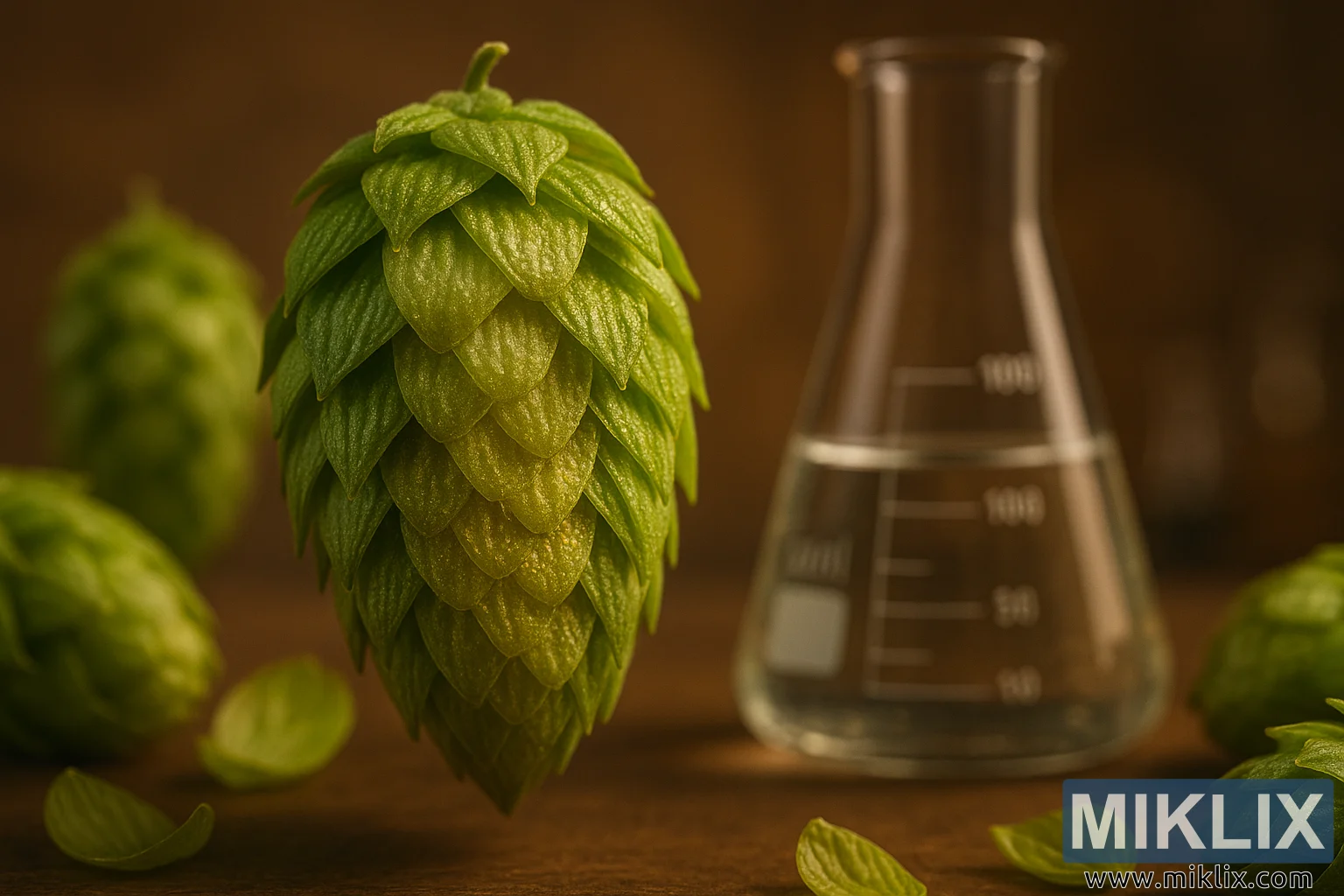 Ngemuva, amathoni athobile namafomu angacacile abonisa indawo yaselabhorethri, mhlawumbe amabhentshi namathuluzi esikhungo sokucwaninga sokuphisa. Kukhona isiphakamiso esanele sokuhleleka kanye nezisetshenziswa ukusikisela ukuhlola okuqhubekayo, nokho imininingwane ithambe ngamabomu ukuze kugcinwe kugxilwe engxoxweni phakathi kwe-hop ne-beaker ngaphambili. Ingemuva elifudumele elinsundu livusa kokubili umhlaba we-rustic we-brewhouse kanye nengaphakathi elicwengekile lelabhorethri, ukuvala igebe phakathi kobuciko nesayensi.